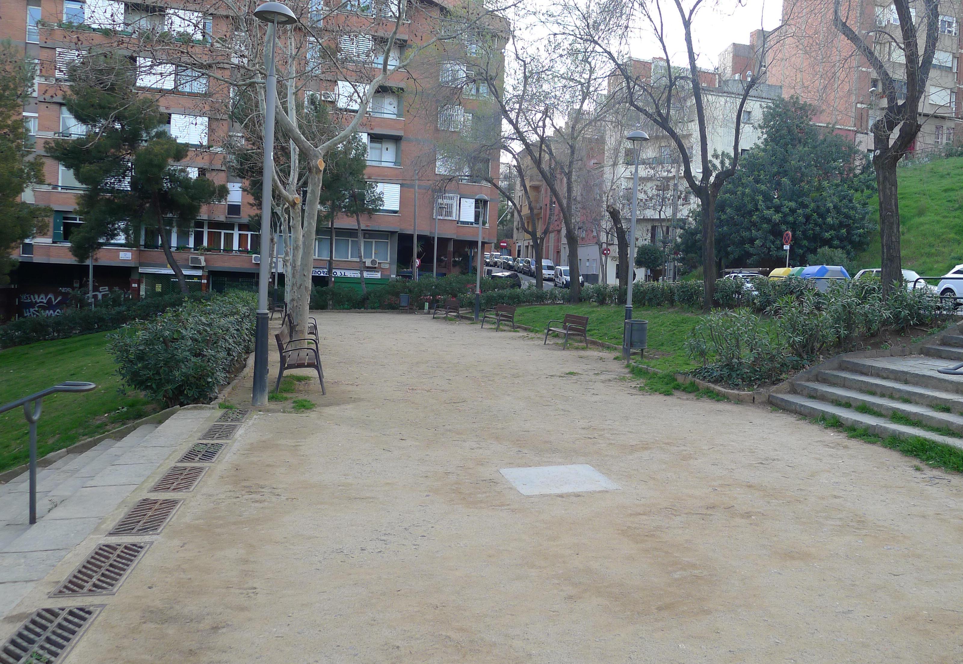La plaça havia dut el nom de Puig i Alfonso (Barcelona 1865-1946), un escriptor i llibreter que fou regidor de l’Ajuntament de Barcelona. L’any 1999 es va fer oficial el nom amb que era coneguda de forma popular. Està formada per diverses terrasses que comencen a l’alçada de l’avinguda Mare de Déu de Montserrat i van enfilant-se fins al carrer Grècia, que la separa del parc. Un dels arbres més presents en aquesta part és la tipuana, amb una flor d’un color groc molt intens que quan cau deixa el terra amb una bonica catifa groga. Aquesta és la part més urbana del parc, amb jocs infantils i taules per a pícnic. També hi podem veure altres espècies vegetals com arbres de l’amor, moreres, oms i oliveres.