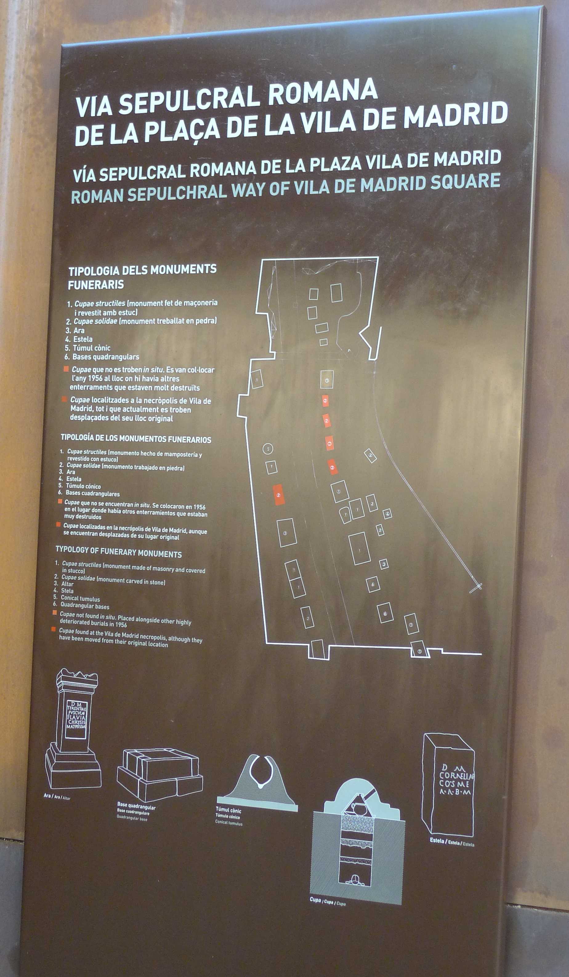 Les tombes i els monuments funeraris que s’han trobat a la via sepulcral de la plaça Vila de Madrid son de diversos tipus. Hi ha enterraments fets directament a la fosa, sense cap protecció, n’hi ha altres amb tegulae, o teules i amb àmfores. Pel que fa als monuments, hi ha esteles clavades directament al terra, hi ha ares, però dels que més hi ha són els coneguts com a cupae, que son monuments funeraris en forma semicilíndrica que recorda una bóta de vi (d’aquí el nom de cupae). En total s’han pogut localitzar 52 enterraments d’inhumació i altres restes aïllades. Aquest espai funerari va estar en ús entre els segles I i III dC i les persones que hi van ser enterrades eren de baixa condició social.
