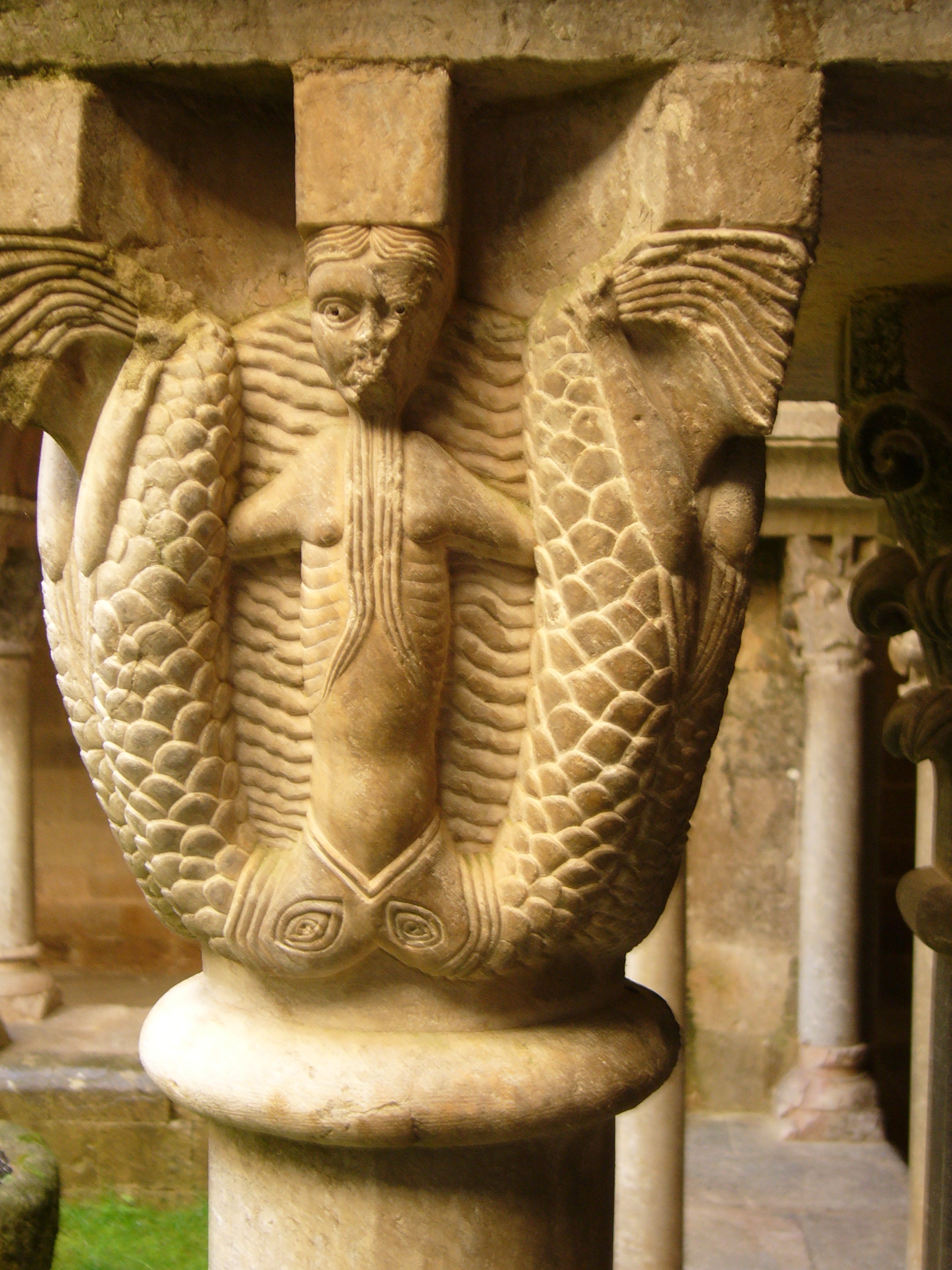 L’escultura del claustre és molt variada. Hi ha representacions vegetals, de cistelleria, animals enfrontats en angle, representacions zoomorfes i figures geomètriques. Entre tots els capitells, en destaca un per damunt de tots per la seva curiositat. És un dels capitells del conjunt de cinc columnes de la galeria oest. I és curiós perquè té les quatre cares iguals: una sirena-peix amb dues cues que s’aguanta amb les dues mans. La seva raresa l’ha convertit en un dels icones de Sant Pere de Galligants. Segons ens explica l’autor del llibre editat pel Museu d’Arqueologia de Catalunya-Girona, fins i tot ha estat objecte d’una de les llegendes gironines modernes: la sirena del Galligants.