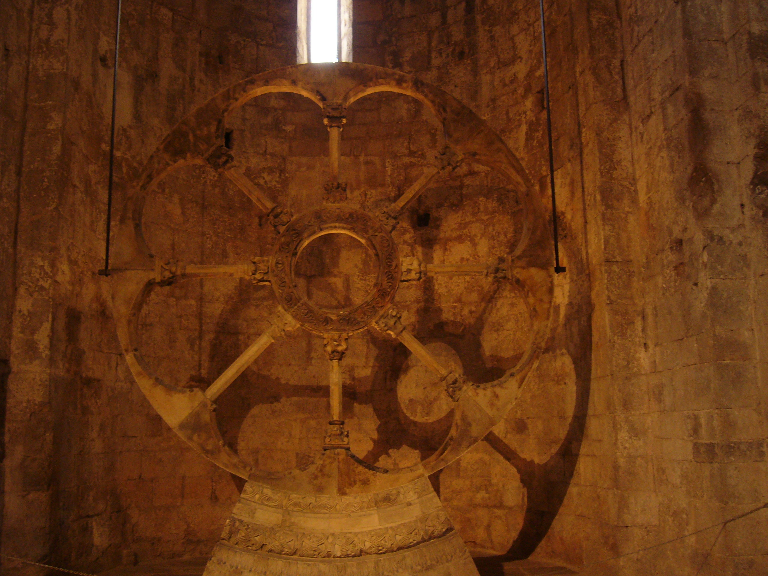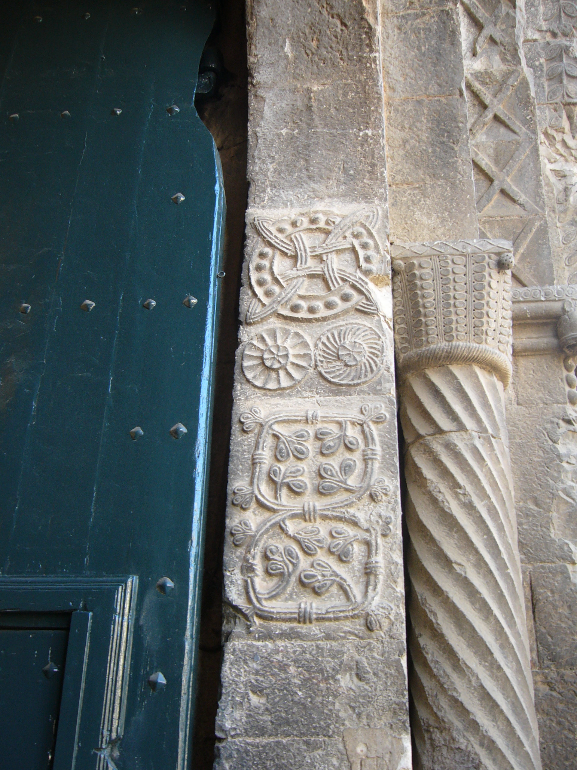 En un dels capitells hi ha la figura d’un abat assegut amb bàcul a la mà, tot i que ara és trencat, envoltat de monjos. Això fa pensar als especialistes que el Pere que s’anomena a la frase, és l’abad que va fer construir la rosassa. Ara bé, aquesta rosassa que podem contemplar a la façana és una reproducció, l’original es pot veure la mar de bé i de ben a prop a l’interior de l’església, al cantó esquerre del transsepte.