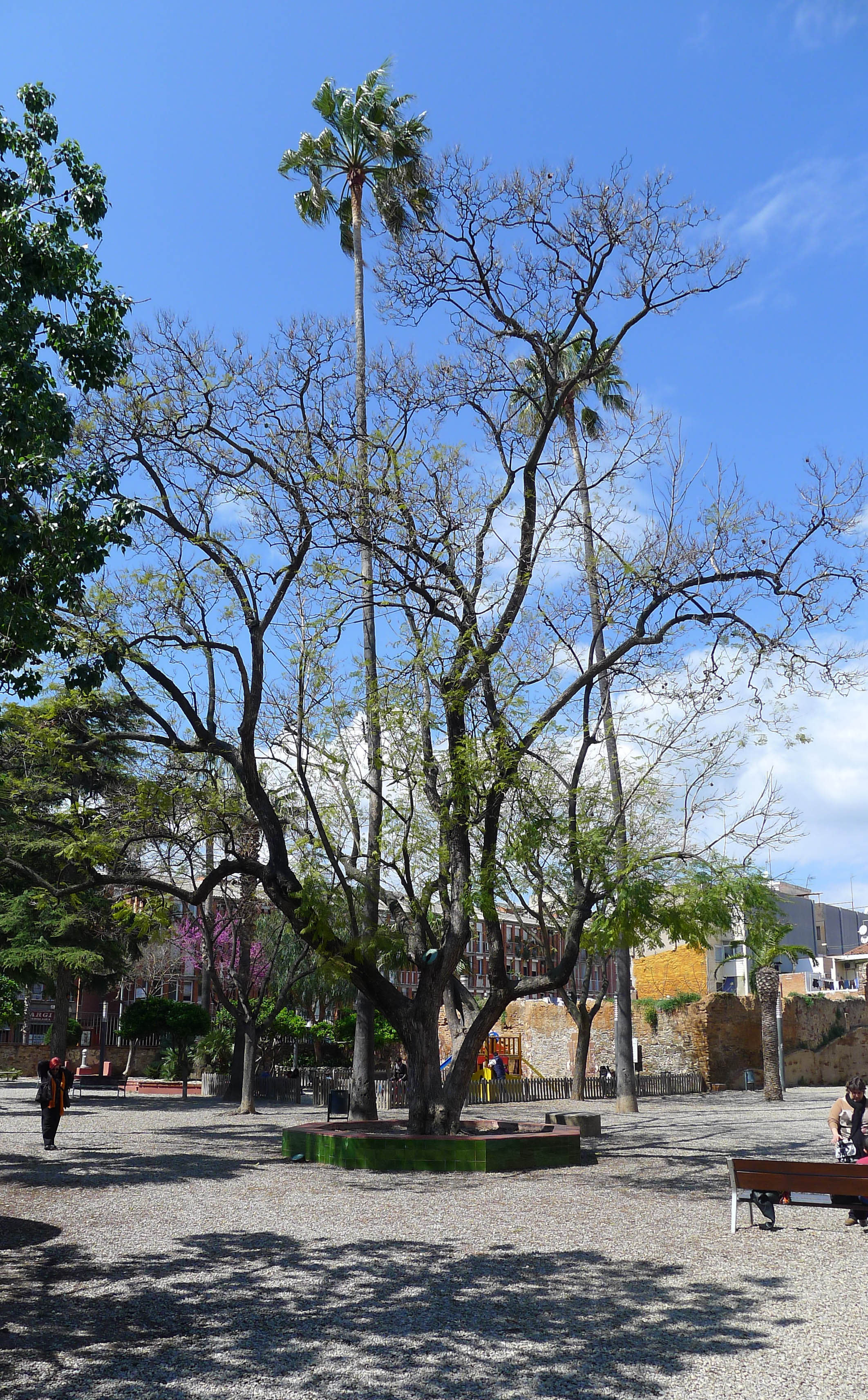 A la part del darrera hi ha l’antic jardí de la finca, avui obert al públic. Entre els elements destacables, hi ha una font amb un plafó dedicat a Sant Joan Baptista, datat el 1955; una antiga font de gruta amb dos plafons dedicats a la mare de Déu del Roser en motiu de la festa de l’arbre; i un gran gabial amb ocells, que criden força l’atenció dels més menuts. Pel que fa a arbres hi ha dos grans exemplars de palmera mexicana i de xicranda. A la façana posterior de Can Modolell hi podem veure una porxada força interessant.
