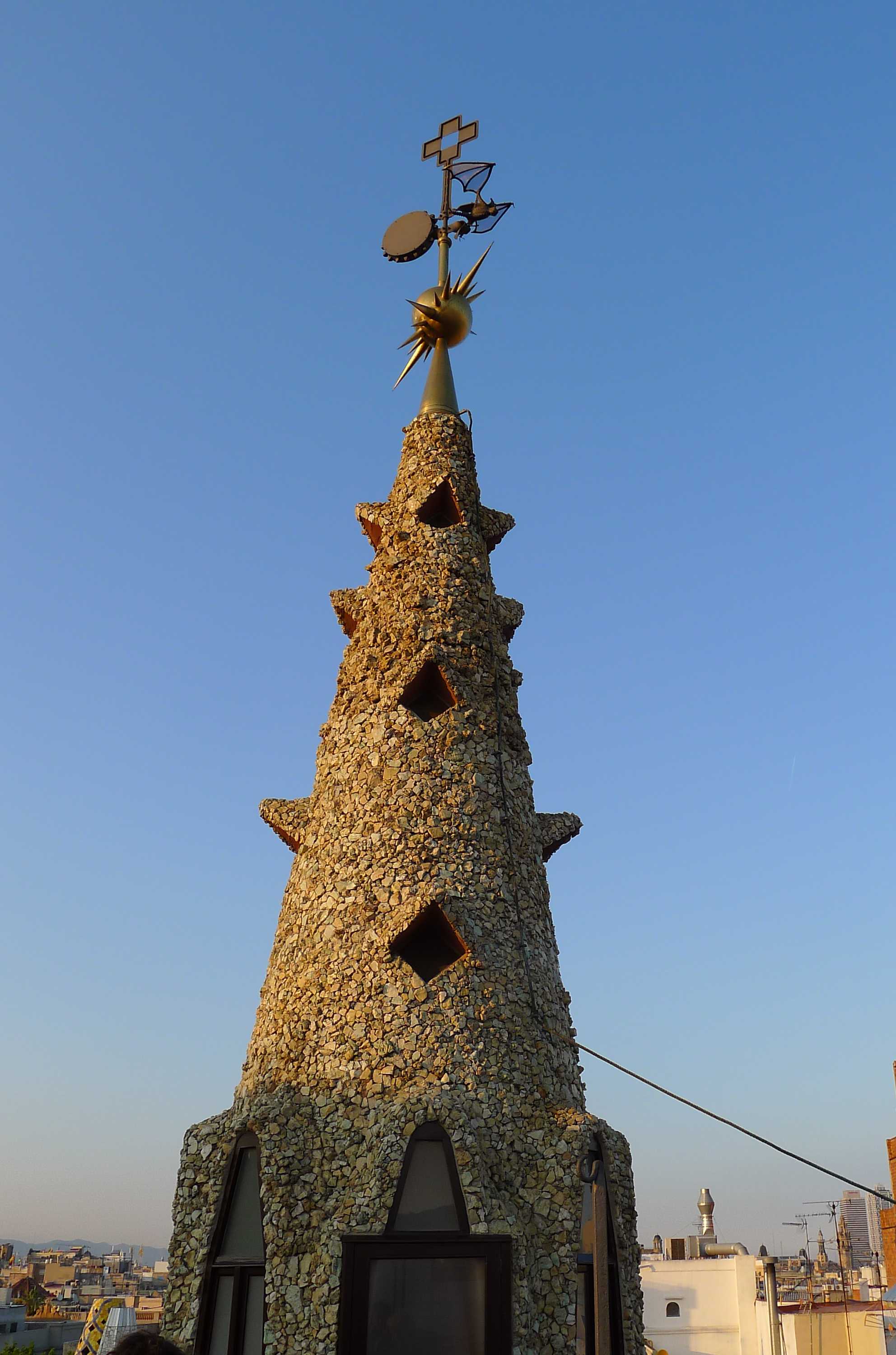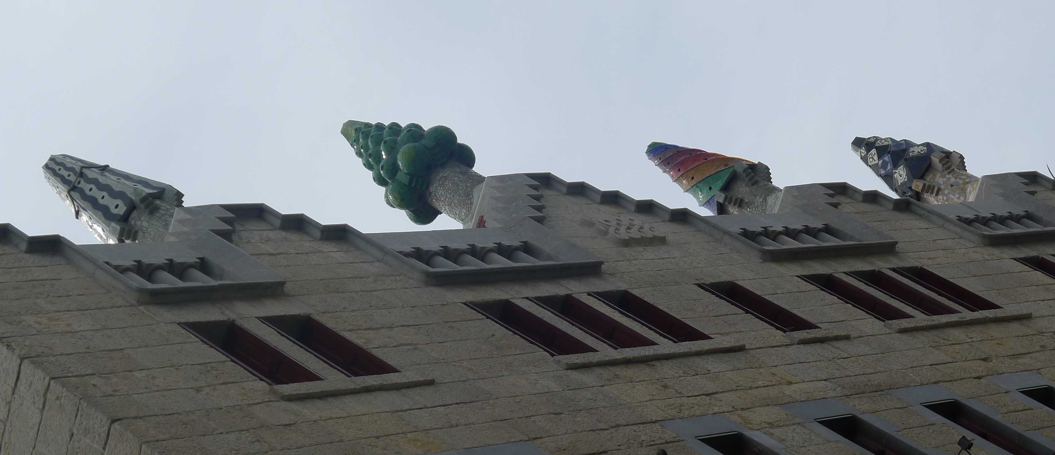 I arribem al final de la visita, el terrat, que és un altre dels elements més característics del Palau Güell. Al centre, s’enlaira, majestuosa, la cúpula de la sala central amb la llanterna en forma d’agulla coronada per un ratpenat de forja sobre una rosa dels vents. Al voltant, sobre un terra ple d’ondulacions, sobresurten les vint xemeneies, totes amb formes diferents, algunes fetes amb maó vist, la majoria cobertes de trencadís amb dibuixos i colors diferents.