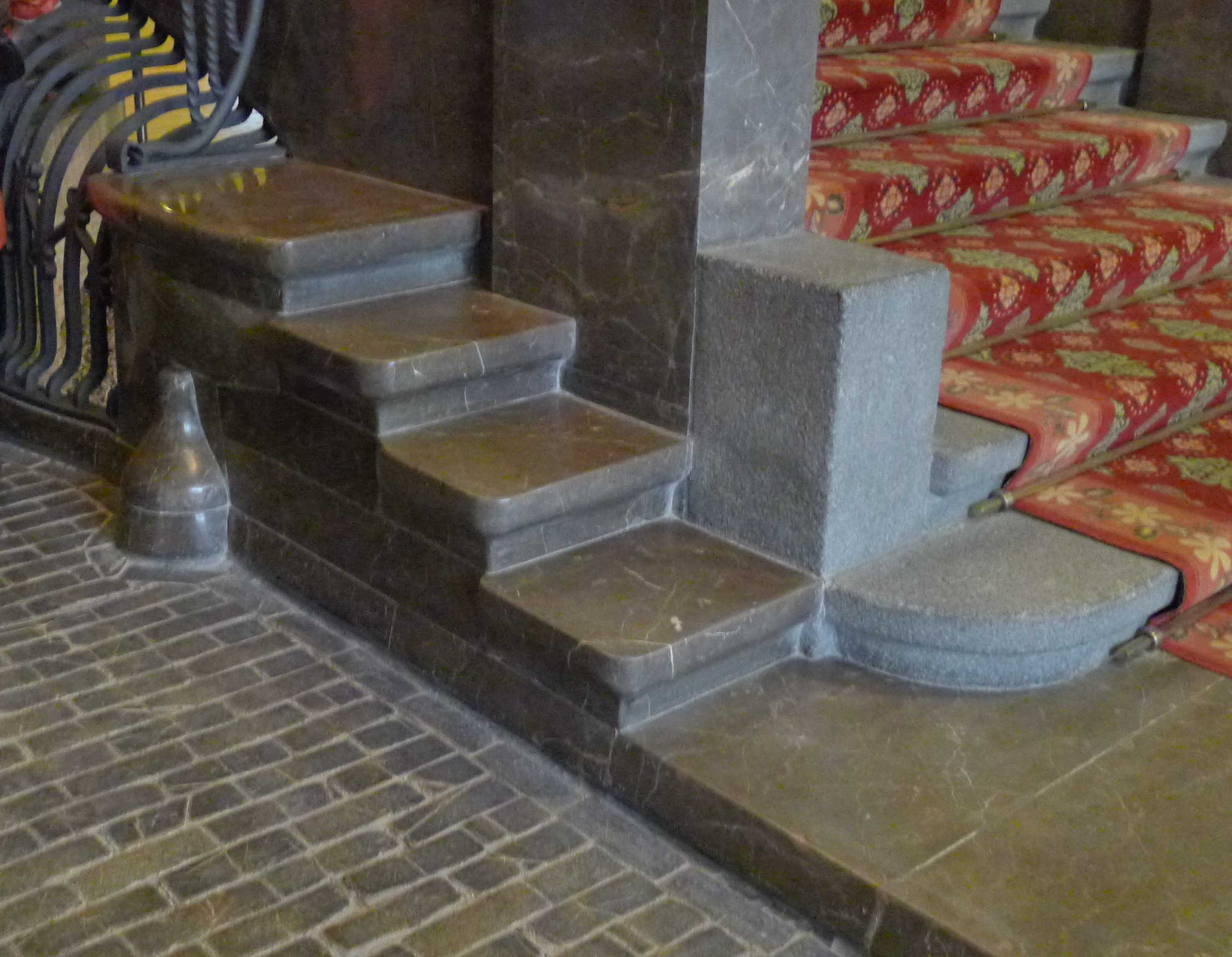 L’entrada al palau Güell es fa pel carrer Nou de la Rambla, número 5, a través dues portes catenàries amb reixes de ferro forjat coronades per dues lletres: E i G, és a dir, Eusebi Güell. Al mig hi ha una llarga i estreta finestra amb una reixa, també de forja i a la part superior hi ha l’escut de Catalunya amb un au Fènix al damunt. Un cop a l’interior del palau, d’entrada podem observar que l’espai està organitzat a l’entorn de l’escala central i dividit en dos, com dos carrers, per facilitar l’entrada i sortida de carruatges. El terra és a dos nivells: una part com empedrada, a nivell de carrer, on si situaven els carruatges i una mena de voreres, amb material més noble, per on caminaven les persones. Aquí comencem a veure la genialitat de Gaudí, amb un altre detall: al costat de l’escalinata que puja cap a l’entresol, separada per la barana que s’enfila amunt, hi ha en una mena d’andana situada a un mig metre d’alçada i a la qual s’accedeix per quatre esglaons. Es tracta d’un element pensat per facilitar l’entrada i sortida dels carruatges.