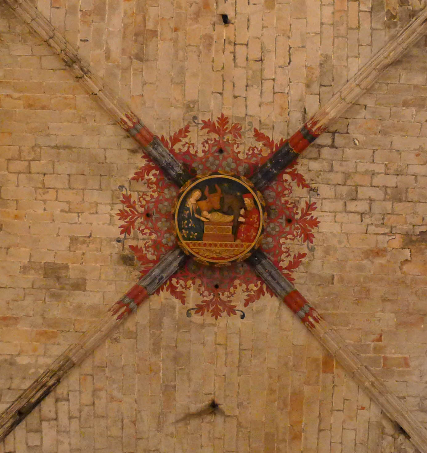 Un dels elements en que cal fixar-se són les cinc magnifiques claus de volta policromes. A l’absis hi ha la coronació de la Mare de Déu, les següents són el pessebre, amb la Mare de Déu, Sant Josep, el Nen, el bou i la mula; la tercera representa l’Anunciació, la quarta és el rei Alfons el Magnànim a cavall i la darrera és l’escut de Barcelona, perquè el Consell de Cent va contribuir a les obres del temple. Cal no oblidar-se de fer una ullada a la rosassa des de l’interior, amb el sol il·luminant els vitralls.