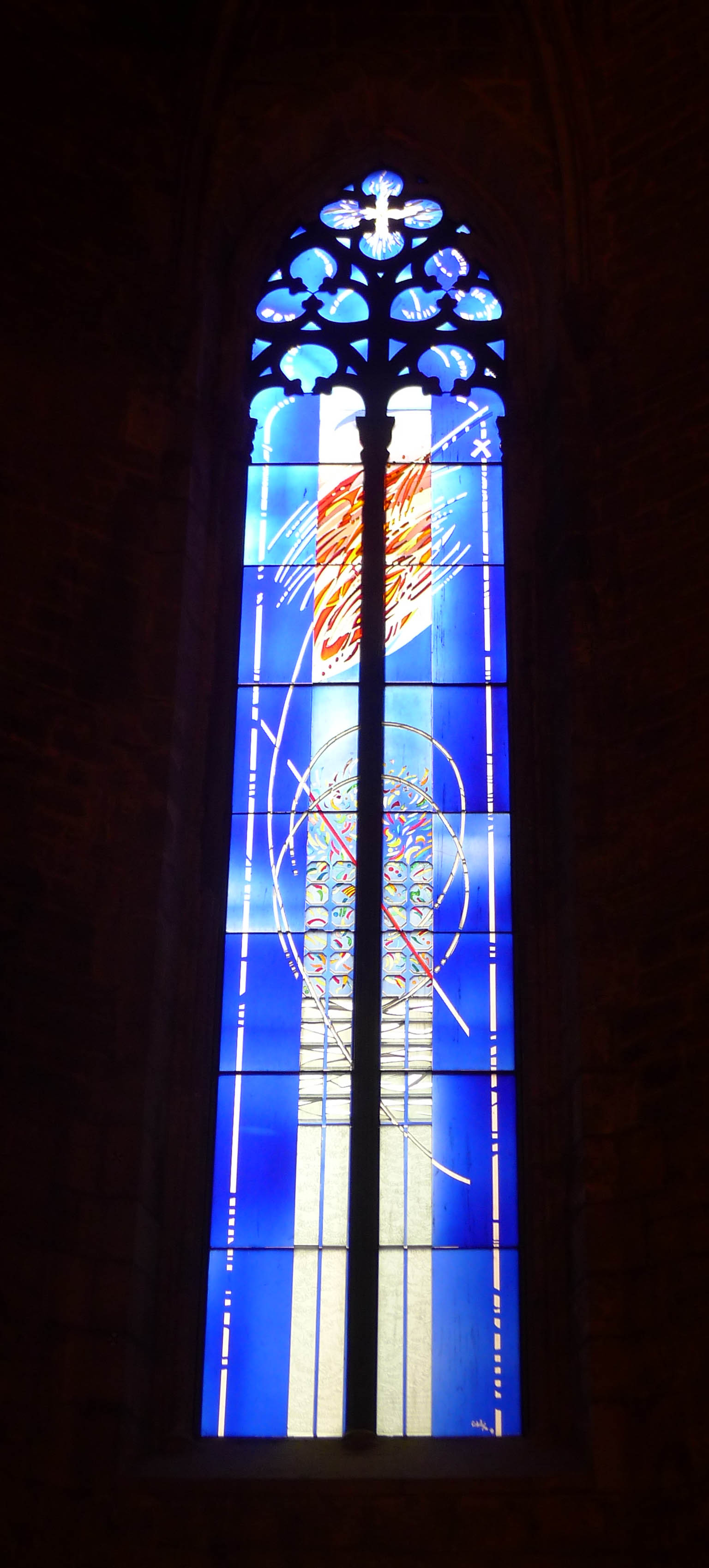 Tal com hem dit abans, l’interior és magnificent, les 34 capelles laterals aprofiten l’espai interior dels contraforts. Els vitralls són molt presents i a diferents alçades. Val la pena aturar-s’hi a mirar-los amb deteniment. A l’esquerra de l’altar major, n’hi ha un que destaca per la modernitat. Es va posar fa uns anys amb motiu dels Jocs Olímpics de 1992. Damunt mateix, n’hi ha un altre que va pagar el Barça en l’època del president Agustí Montal. S’hi pot veure, a la part de baix, l’escut del club.