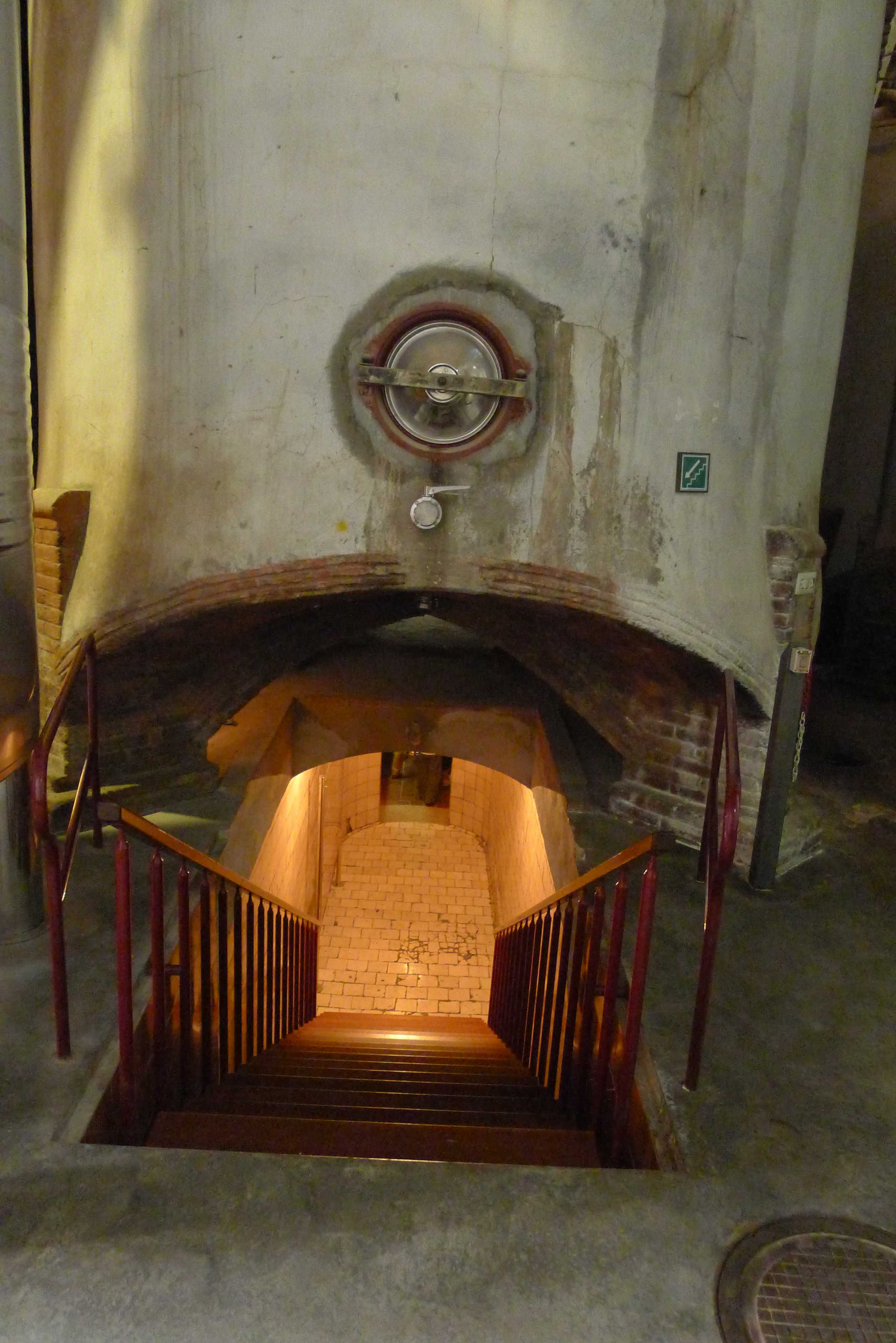 Abans d’arribar a la sala d’audiovisuals, uns plafons expliquen els elements arquitectònicsmés destacats i en què cal fixar-se de l’edifici. És aquí que ens expliquen que el celler on som és un edifici de planta rectangular distribuït en tres naus de 46 metres de llargada per 12,5 d’amplada, que hi ha 60 cups soterrats i 60 tines, amb una capacitat total de 34.300 Hl.