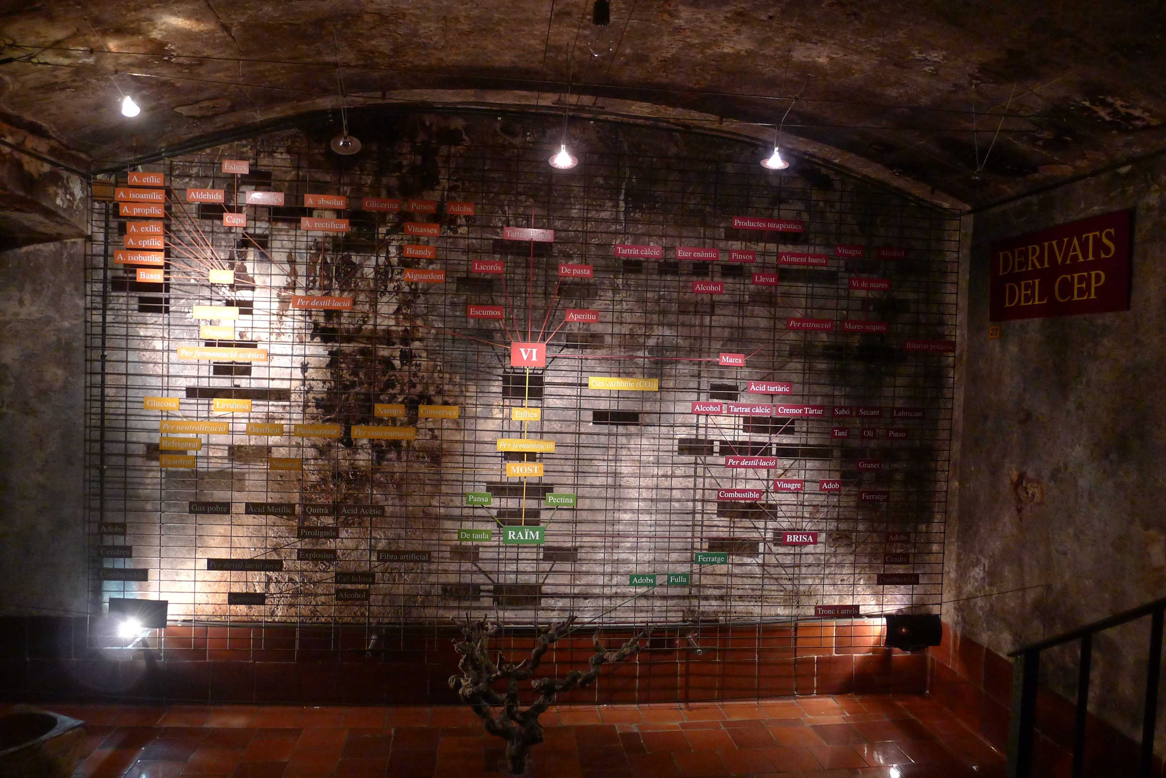 La mostra explica, també, des d’on ve el cultiu de la vinya i la cultura del vi i ensenya com s’elabora el vi. Un gran plafó ens permet saber d’on venen tots els derivats del raïm, des del most a l’esperit de vi, passant pels diferents i més variats licors.