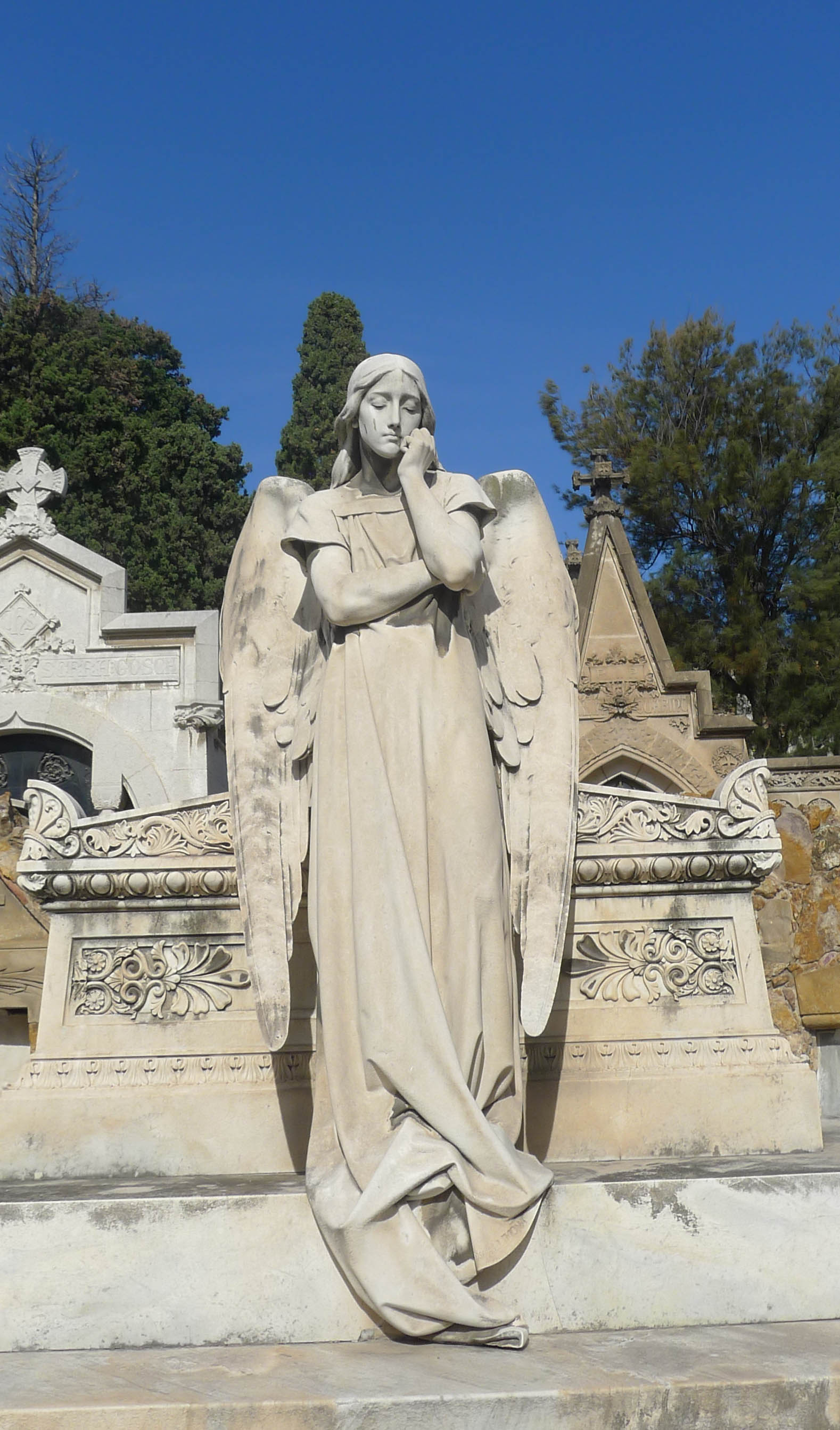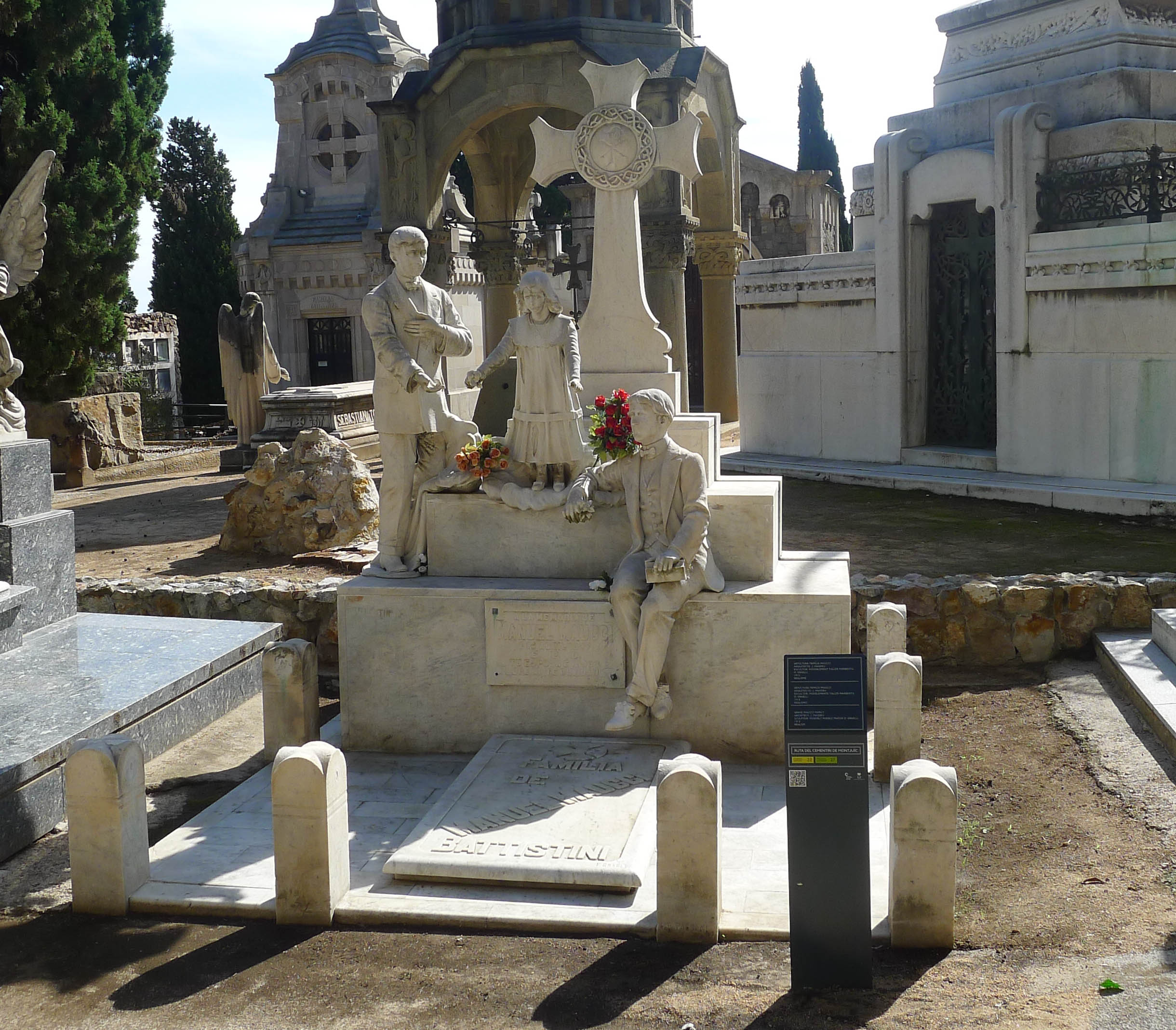 Entre les escultures, cal destacar les de la sepultura de la família Maucci, on hi podem veure les escultures dels tres fills de la família: Isabel, morta el 1898, i Valentín i Domingo, morts tots dos el 1912. Aquí podem veure, per una banda, com a en aquella època la mortalitat infantil era alta i, per altra, com era la moda en el vestir de les criatures de les classes benestants. Una altra escultura destacable, és la del panteó Vial i Solsona, construït per l’arquitecte Josep Balet entre 1901 i 1902. De fet, el panteó és força sobri, però hi destaca amb molta força la figura de marbre, d’un home jove, gairebé nu -només porta una mena de faldellí que li cobreix la part baixa de l’abdomen i el principi de les cuixes- amb un pic a les mans i en actitud de cavar la seva pròpia fosa. Aquesta escultura és obra d’Enric Clarasó i va ser premiada amb la primera medalla a l’Exposició Internacional de París de l’any 1900.