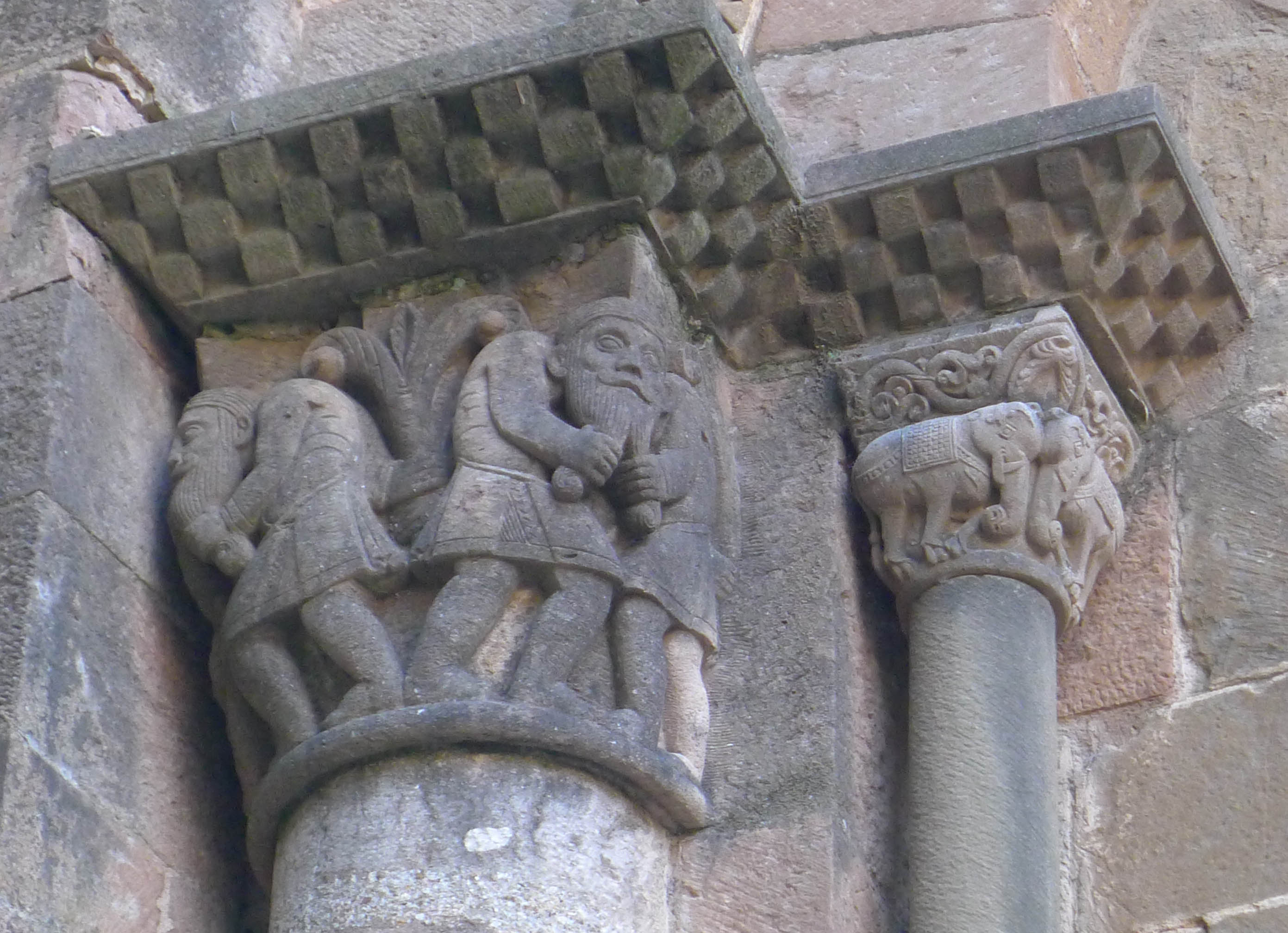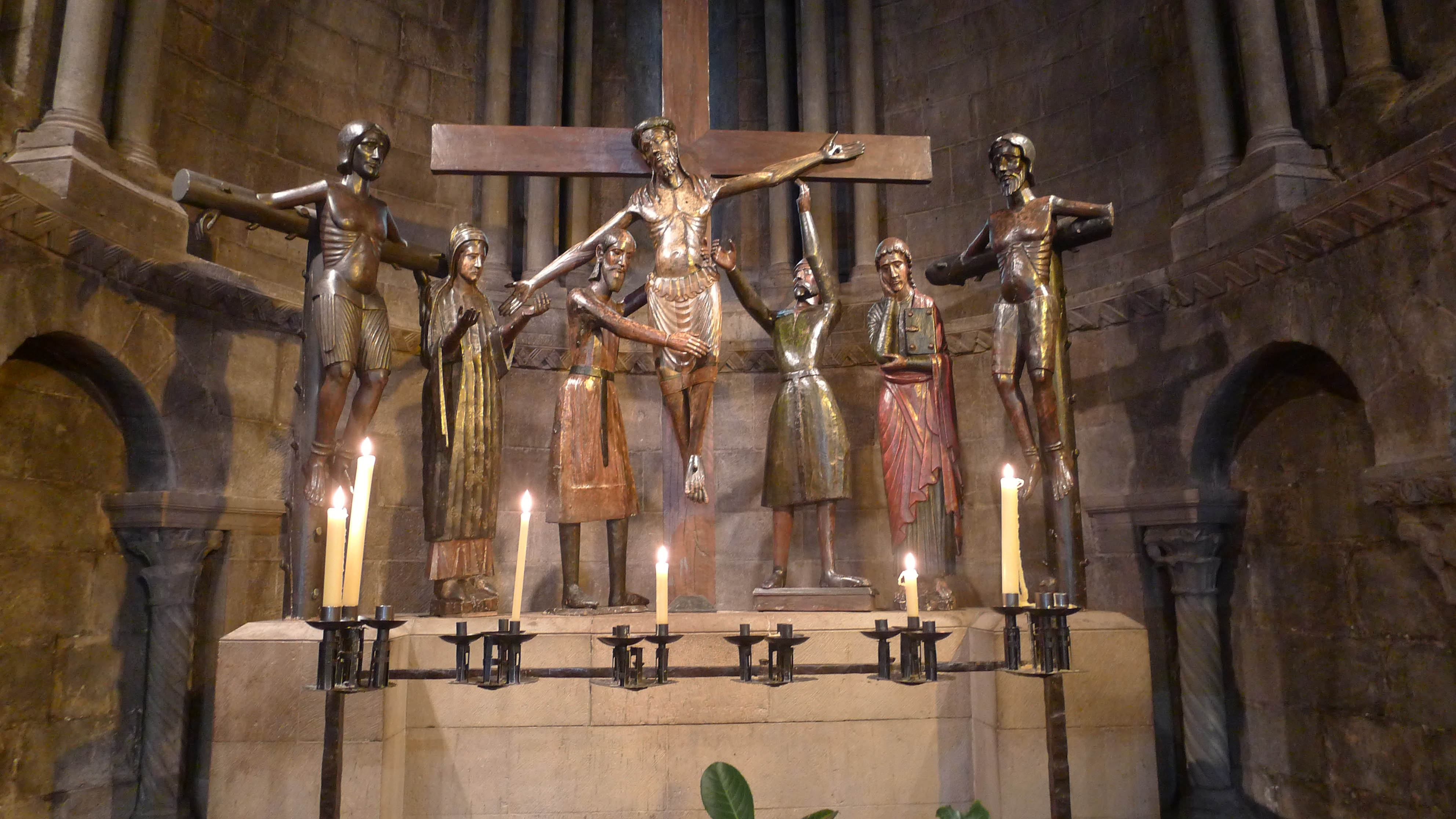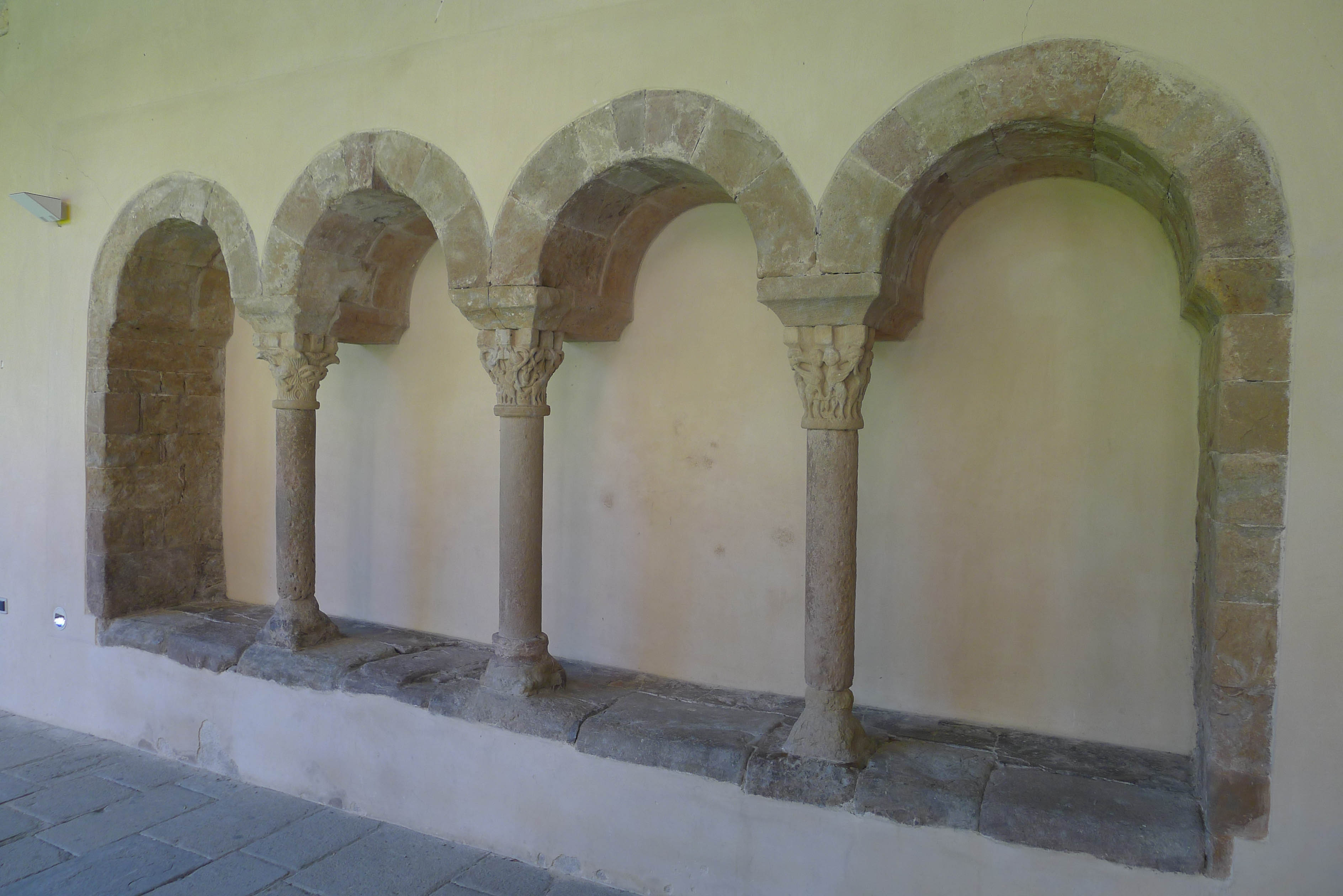 Hem vist com va començar la història, hem fet un repàs a la llegenda, acostem-nos ara a l’arquitectura. Com passa sovint, i com hem vist en altres llocs que hem visitat en les nostres sortides amb gràcia, l’edifici que podem contemplar avui és fruit de diverses actuacions. D’entrada cal dir que el mes de febrer de 1428 un terratrèmol va provocar l’esfondrament d’un claustre romànic, substituït posteriorment pel claustre gòtic que podem contemplar avui, i de part de la capçalera de l’església. Dos anys abans s’havia produït un fet que va marcar la vida del monestir: En restaurar el grup escultòric del Devallament –l’únic d’estil romànic que es conserva in situ a Catalunya-, va aparèixer, dins un receptacle fet a l’interior del cap de la figura de Crist, un Hòstia consagrada incorrupta que hi havia estat dipositada en el moment de la consagració de les imatges, l’any 1251, gairebé dos segles abans. En aquell moment va néixer la devoció del Santíssim Misteri, nom amb que es coneix aquest conjunt escultòric que presideix l’absis central de l’església. Està format per set peces: la Mare de Déu, Crist, Sant Joan, Josep d’Arimatea, Nicodem i els dos lladres: Gestes i Dimàs.