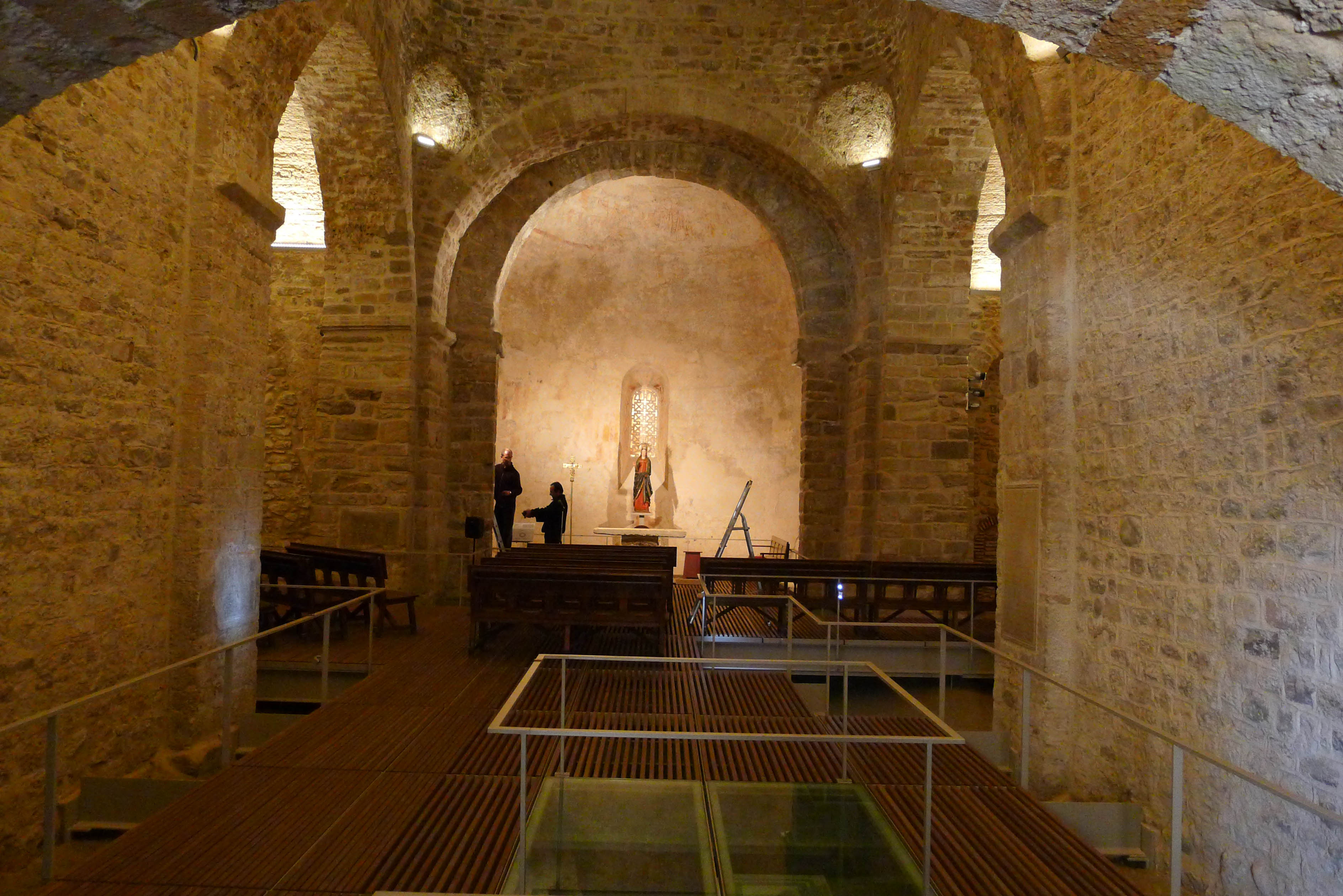 Tot i aquestes restes dels segles V i VI, el que podem veure en el conjunt d’aquesta esglèsia en l’actualitat és d’èpoques posteriors. De fet estaria construïda en diverses fases: primer meitat del segla V, segona meitat del mateix segle i entre els segles VI i VIII. Al transsepte sud hi ha un mural amb unes pintures romàniques molt ben conservades amb imatges dedicades a Sant Tomàs Becket, arquebisbe de Canterbury. Mort l’any 1170, el seu culte es va estendre ràpidament.