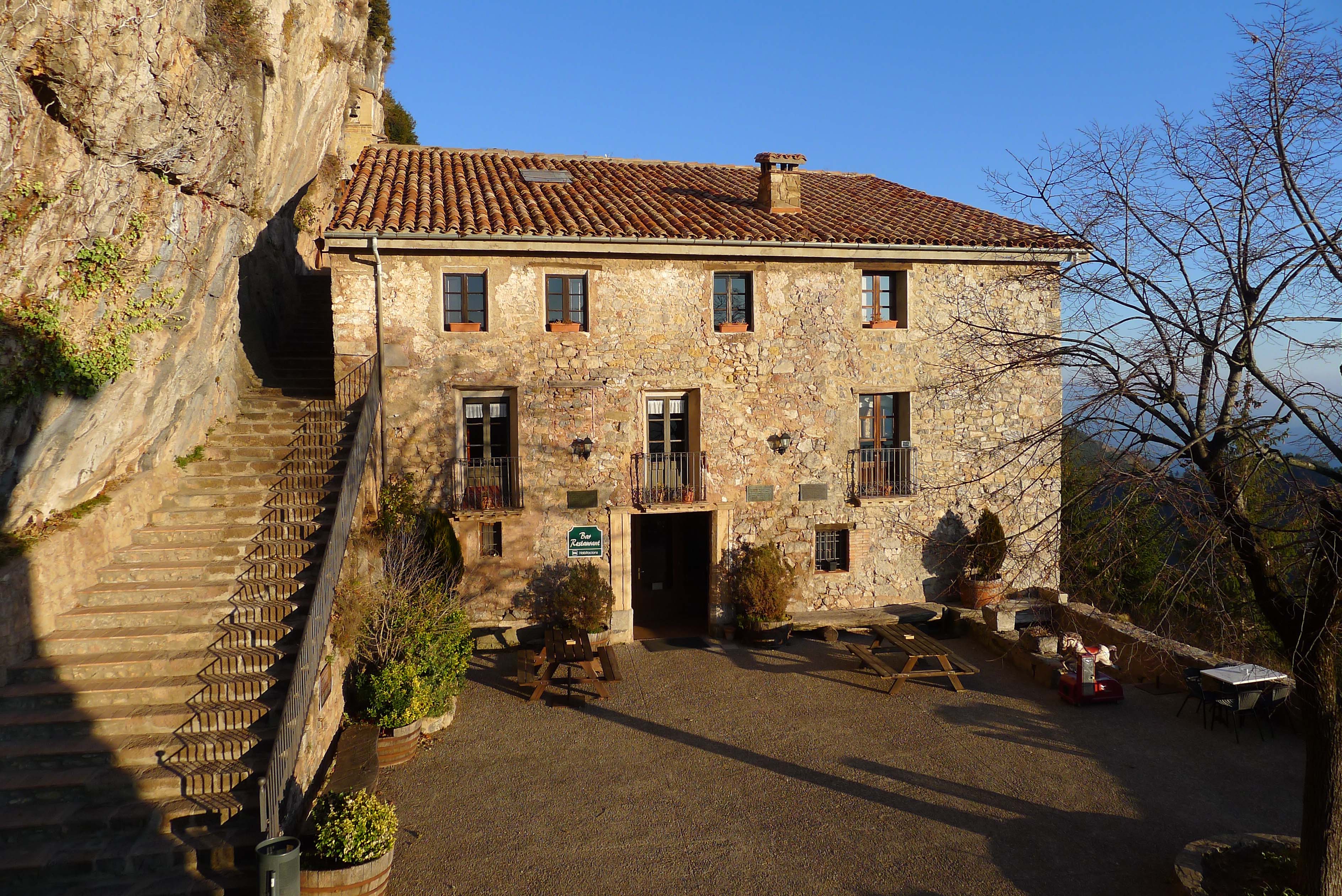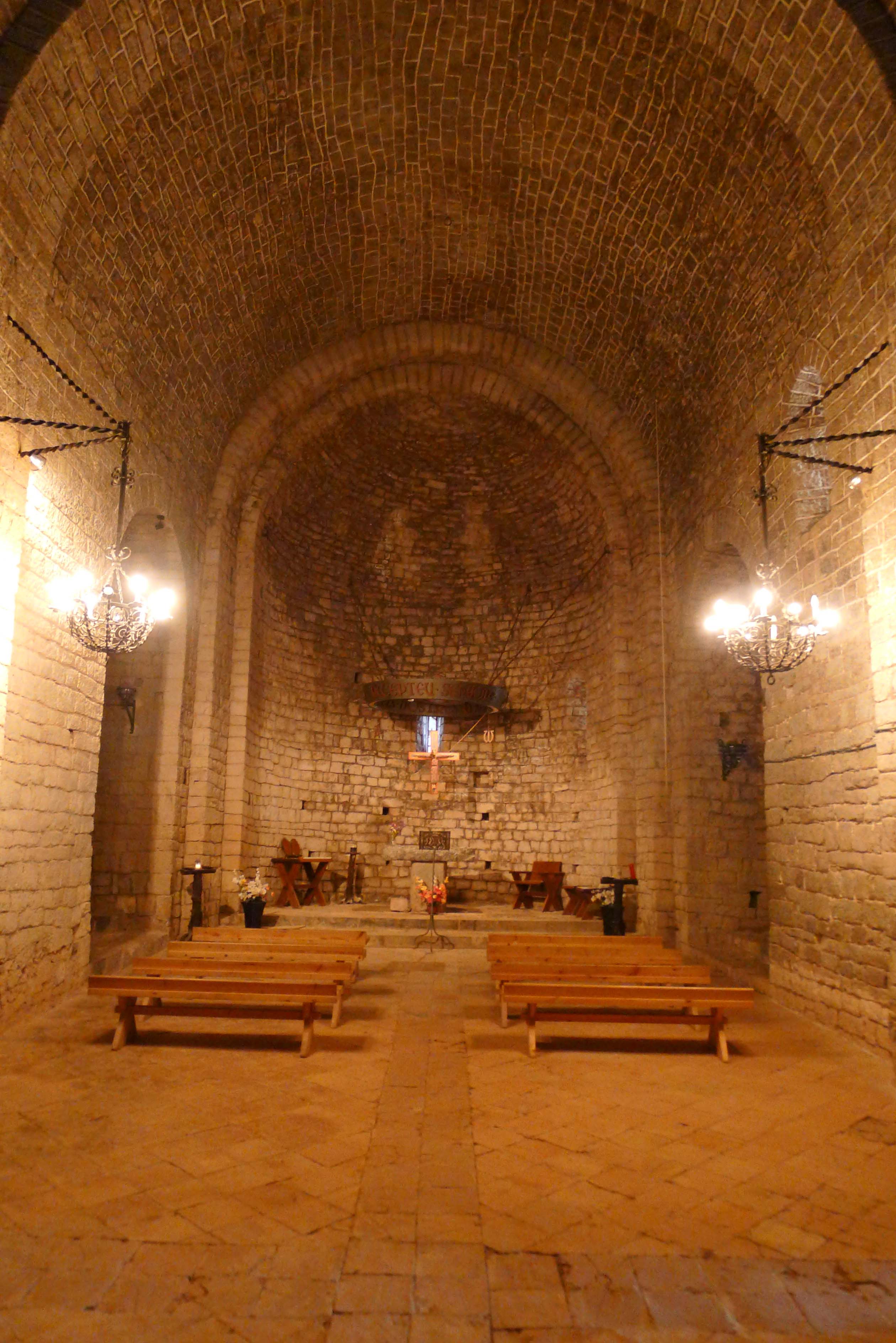 Quan hom veu aquells 72 esglaons i, sobretot, quan comença a pujar-los, s’adona del que devia costar de fer-los. Si tirem amunt, primer trobem la capella de la Mare de Déu, un habitacle no gaire gran, excavat a la balma, i si seguim escales amunt, arribarem a una mena de petit altiplà on hi ha l’església romànica de Sant Pere.
