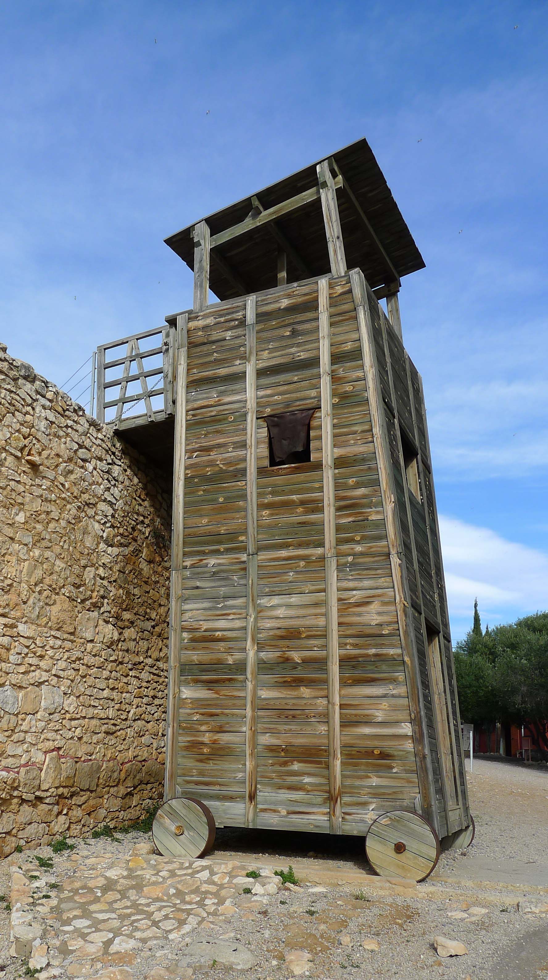 Una de les primeres coses que sobten quan es comença la visita a La Ciutadella, més enllà de la muralla i de la torre de defensa que guarda el recinte, és una torre d’atac de fusta com les que utilitzaven els romans per assaltar les fortificacions. És una manera de mostrar un dels elements bèl·lics utilitzats a l’època. Qui tingui esperit una mica més aventurer i no vulgui accedir a l’interior del poblat per la porta de la muralla, pot fer-ho enfilant-se per aquesta torre d’assalt i entrar directament al camí de ronda de la muralla.