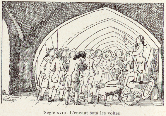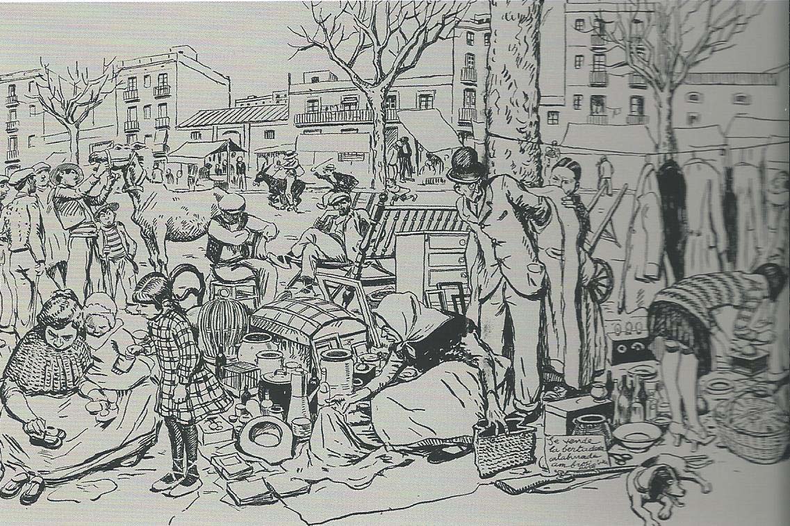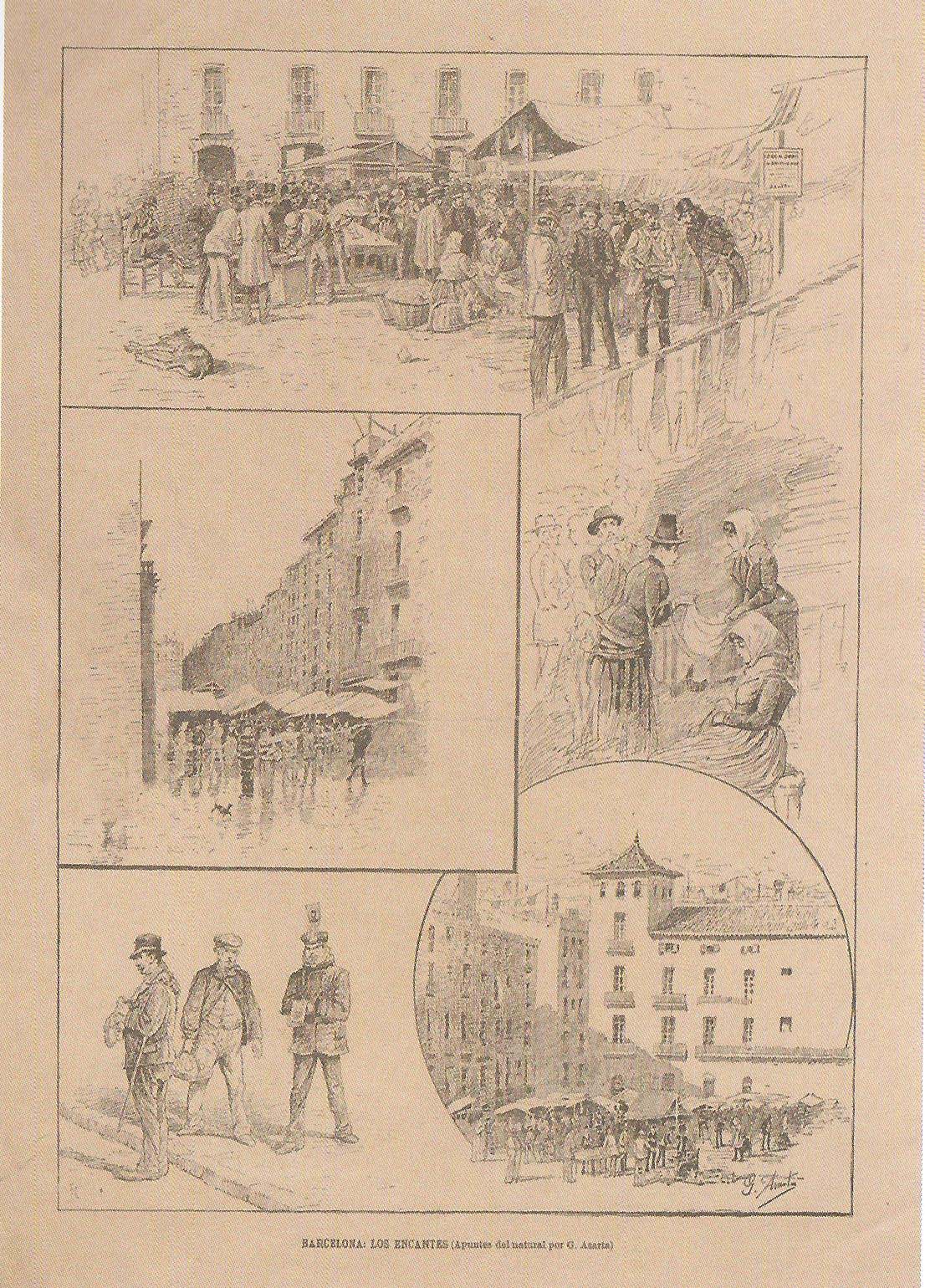 Com fem habitualment, però, anem a la història. El primer que cal dir és que l’origen dels Encants no està massa clar. Tot i això, sembla que cap a l’any 1200 ja se celebraven subhastes i vendes a l’encant als porxos de la plaça de Sant Jaume, que era molt diferent de com la coneixem avui. Aturem-nos un moment per saber d’on ve això de subhasta i de venda a l’encant. La paraula “subhasta” ve de força antic, fins i tot de l’època dels romans, quan els legionaris venien el seu botí de guerra. Ho feien plantant la seva llança a terra amb una bandereta a la punta i a sota hi posaven els objectes que volien vendre, és a dir, venien sota l’asta: “sub asta”. La paraula “encant” ve del fet que les mercaderies s’anunciaven a crits, o cantant, és a dir “en cant”.