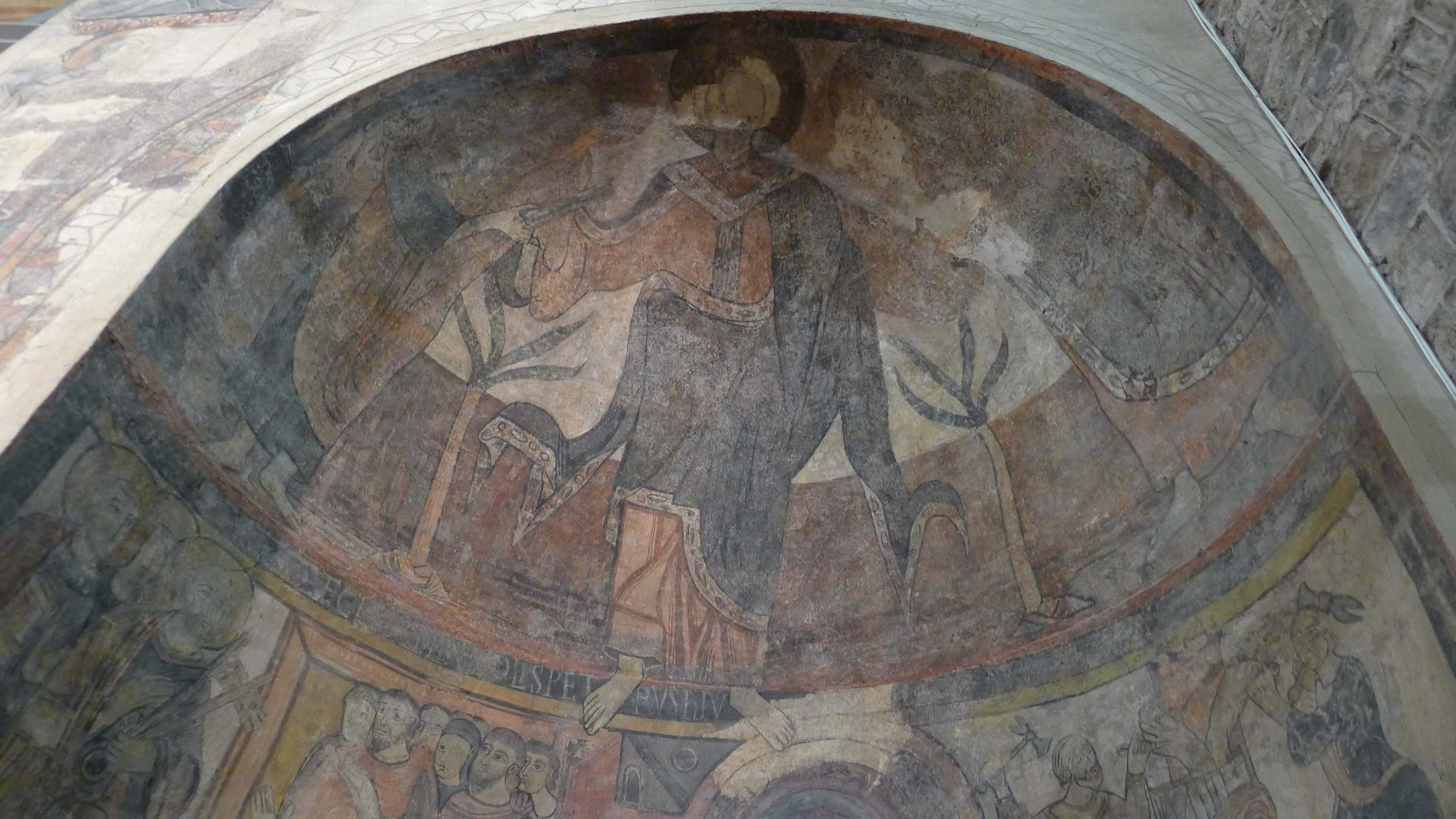 Al damunt de tot, a la part del sostre de l’absis  hi podem veure el Pantocràtor: el Crist en majestat  emmarcat per la màndorla i en actitud de beneir. L’envolta el tetramorf, és a dir, els símbols dels quatre evangelistes: l’àngel que simbolitza Sant Mateu; el lleó, símbol de Sant Marc;  el bou, que simbolitza Sant Lluc; i l’àliga, que representa Sant Joan. A banda i banda del pantocràtor hi ha el judici de Salomó i Adam i Eva.