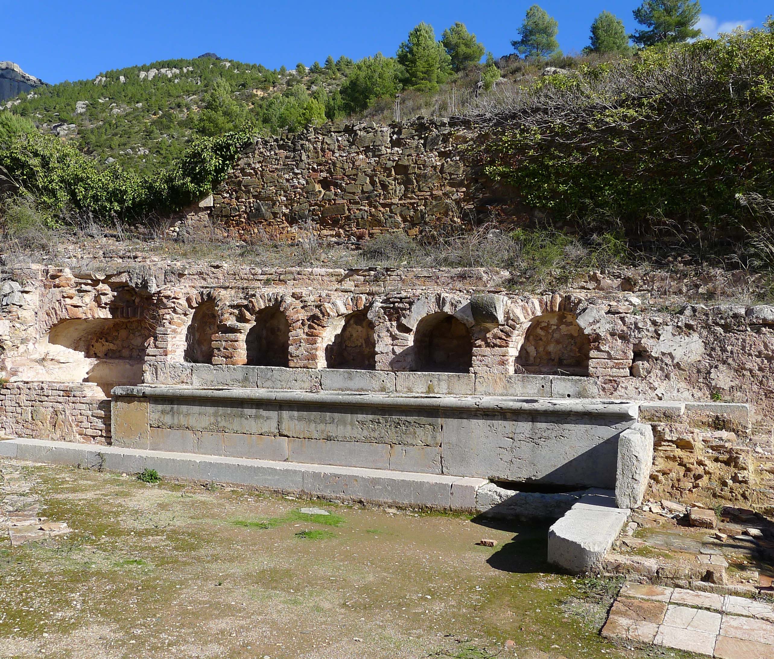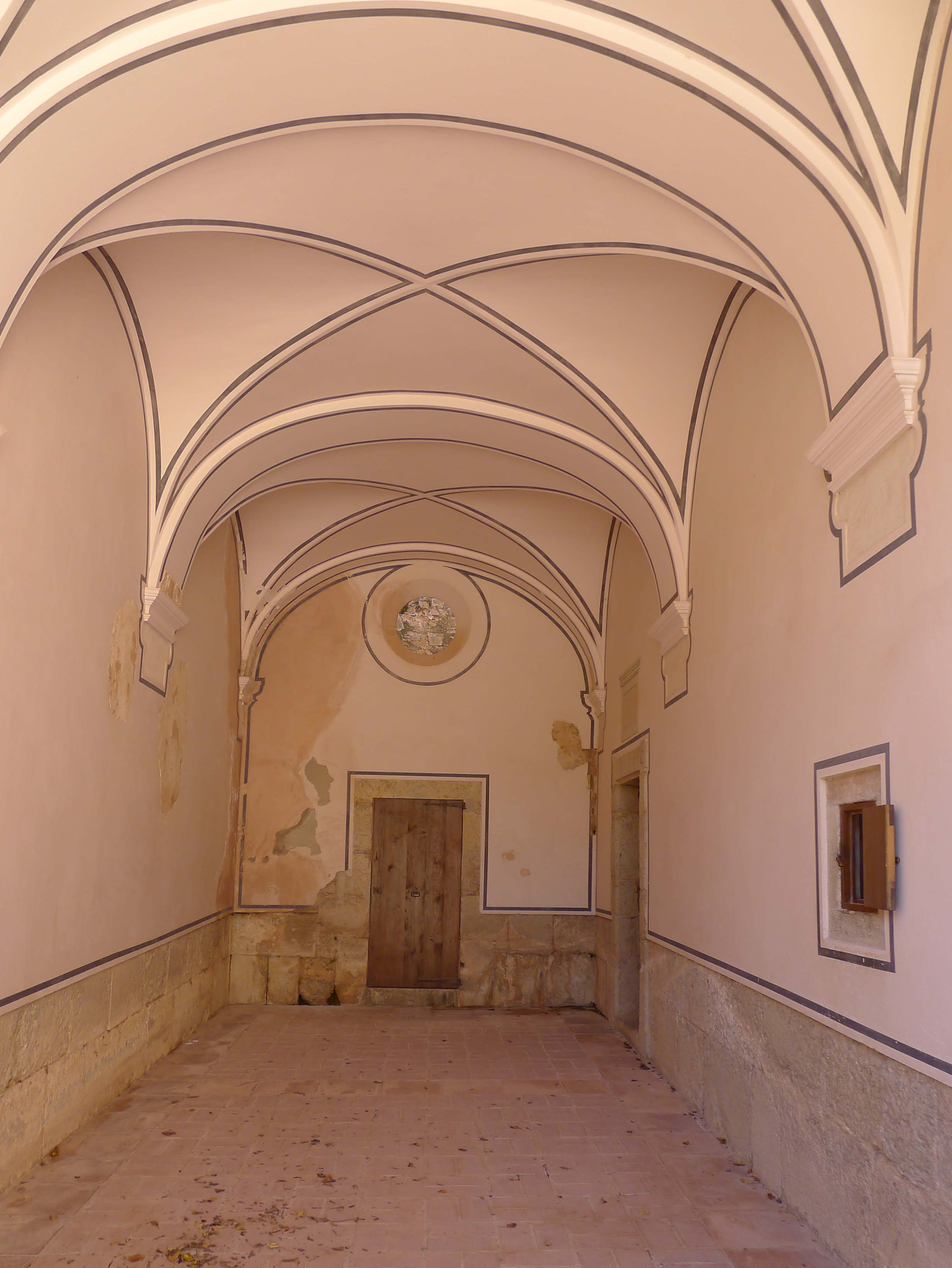 Acabada la visita a la cel·la, tornem a sortir al claustre per voltar-lo i començar la tornada al punt de sortida. Abans d’arribar al claustre dels rosers, passem per les capelles i pel Sagrari, i la banda esquerra hi ha restes de cel·les. A l’interior d’una d’elles hi ha un seguit de piques, aquesta era la cel·la del monjo que tenyia la roba. Des del segon claustre arribem de nou al pati de l’Ave Maria.