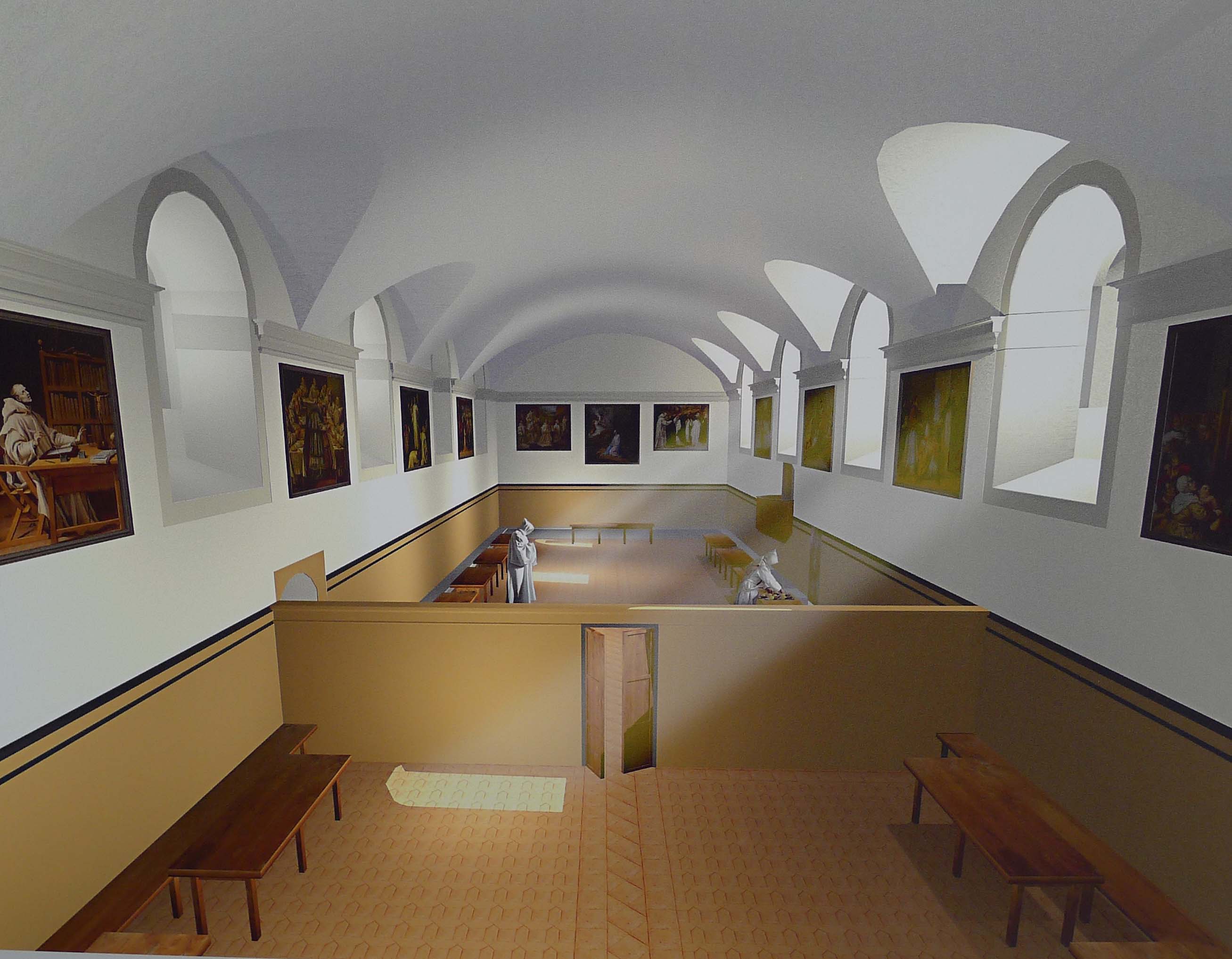Un mica més enllà trobem un pati del segle XVI, des del qual passem a un dels punts neuràlgics del recinte, la placeta de l’església, a l’entorn de la qual hi havia la biblioteca, l’església, que avui està en molt mal estat, l’edifici destinat als germans llecs, que ha estat reconstruït. Un corredor que va en paral·lel a l’església, permet accedir al claustre menor, totalment reconstruït a partir de les peces que es van trobar en desenrunar el lloc. Al costat hi ha el refetor, on la comunitat dinava plegada els diumenges i festivitats, això si, en silenci rigorós. Pares i germans llecs menjaven separats per un envà de dos metres d’alçada, del qual encara se’n pot veure restes de l’arrencada en un cantó. En una punta del refetor hi ha un audiovisual que mostra com es va refer el claustre menor.