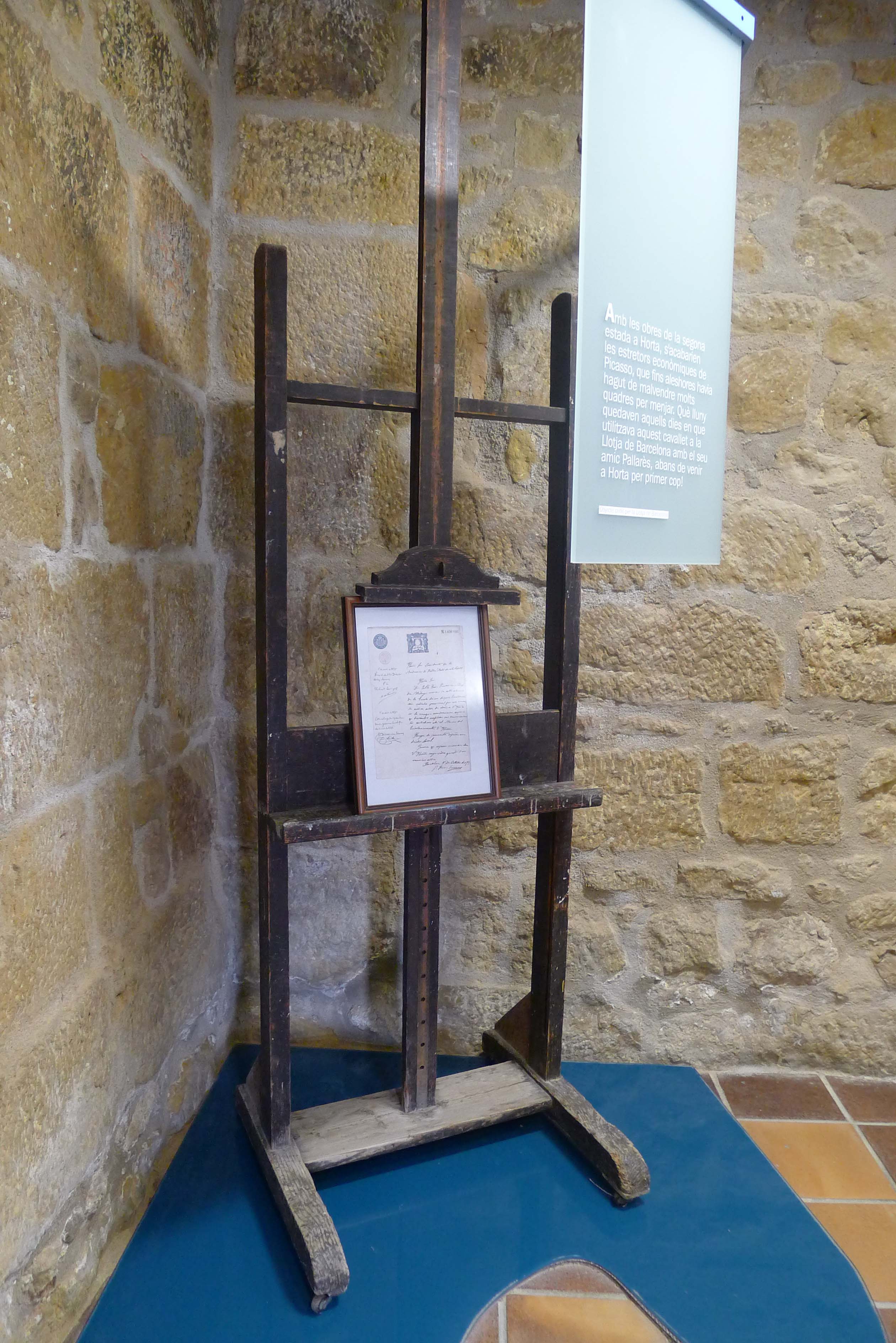 Tornem a l’exposició del Centre Picasso, on hi podem veure objectes i fotografies que il·lustren les dues estades del pintor a Horta, perquè deu anys després d’haver-hi passat els mesos de convalescència, Picasso hi va tornar, l’estiu del 1909, amb la seva companya d’aleshores, Fernande Olivier. Entre els objectes hi ha el cavallet que utilitzava l’artista a Llotja de Barcelona abans d’anar a Horta per primer cop. O la tauleta i les cadires del bar on Picasso i Fernande passava les vetllades bevent anís del Mono, conversant i jugant al dòmino. O un bitllet de mil pessetes, com el que el pintor va donar a uns menuts del poble perquè compressin caramels, la cosa és que no n’havien vist mai cap i van pensar que era fals.