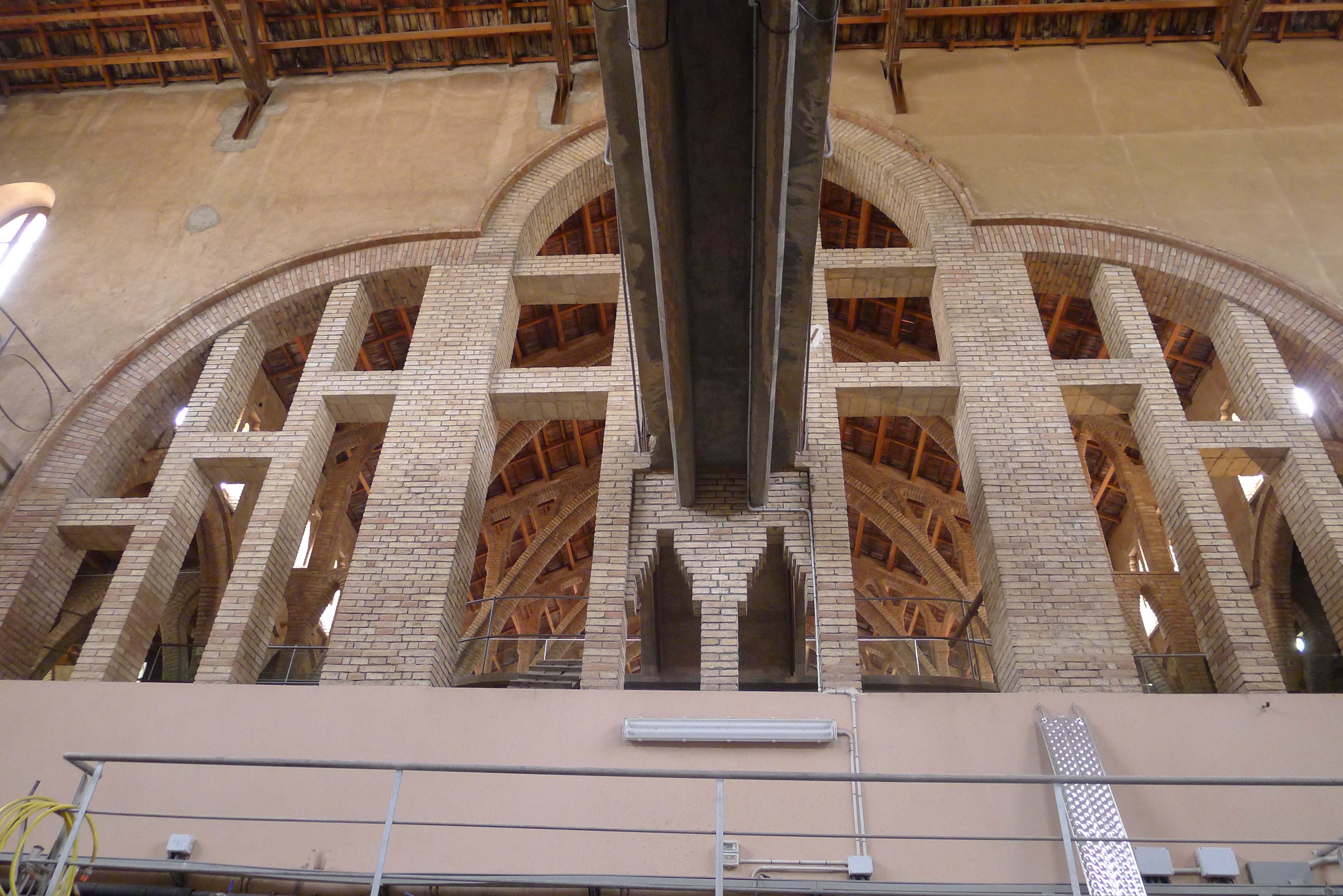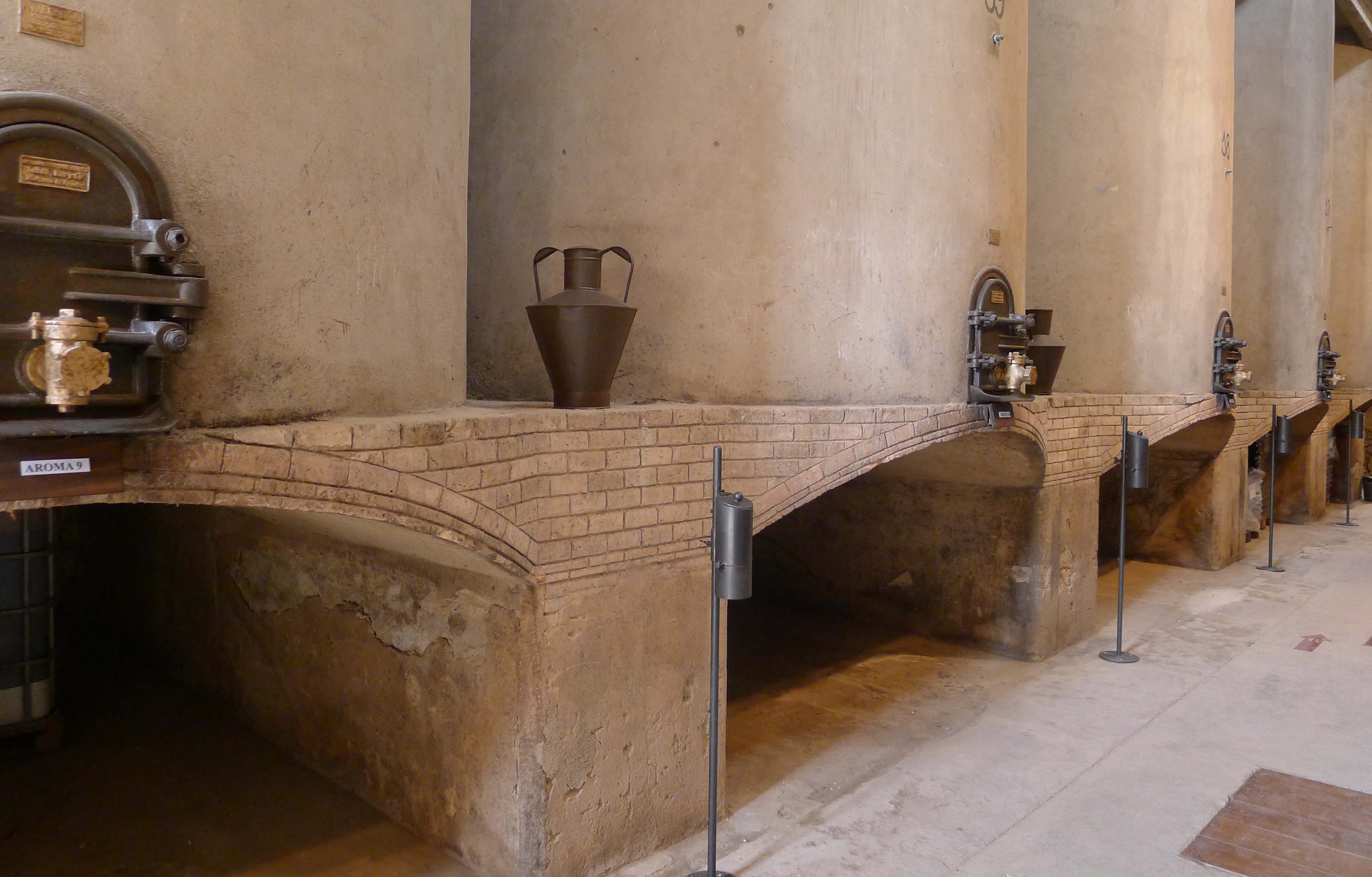 El recorregut ens porta al primer pis, on podem admirar els arcs parabòlics de grans proporcions, fets amb maons i amb els carcanyols foradats –també els vam poder veure al celler de l’Espluga de Francolí-, fet que dona una gran amplitud i lluminositat a tot l’interior. Retornats de nou a la planta baixa, cal no perdre’s una increïble escala enganxada a la paret de la nau d’elaboració, que sembla que s’aguanti penjada al buit.