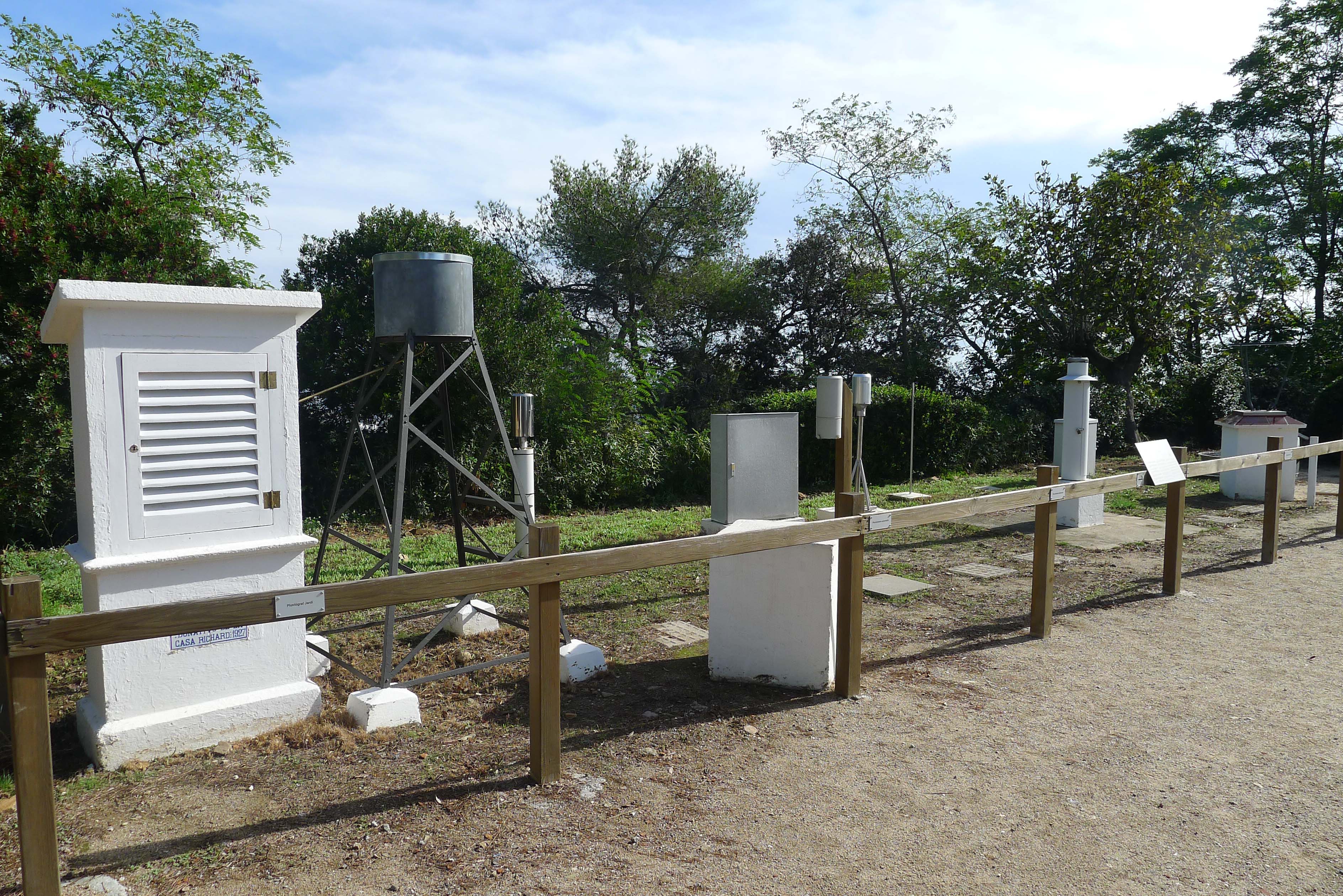 Tornem a l’exterior de l’observatori, on podem veure un jardí amb unes plaques ceràmiques que expliquen quin tipus d’arbre o arbust tenim al davant. També podem veure diferents instruments de mesurament, com pluviòmetre, pluviògraf, termòmetres aeris o termòmetres de subsòl, entre altres. Davant l’entrada principal, que dóna la cara a la ciutat, hi ha un mirador des d’on podem gaudir d’una bonica panoràmica del pla de Barcelona, amb un plafó que ens ajuda a situar-nos.