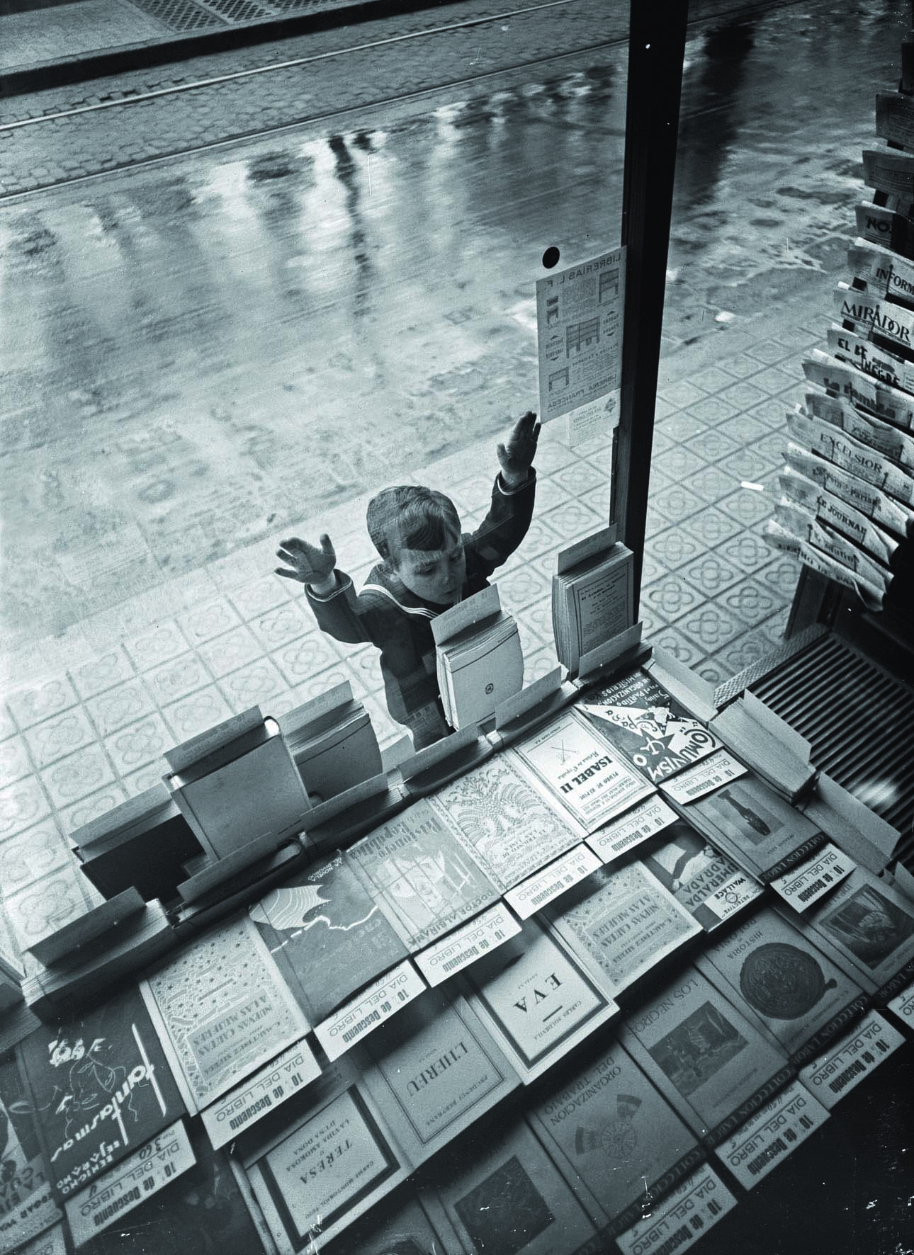 Entre les imatges que hi ha a l’exposició, n’hi ha un bon grapa de destacables. De fet, una de les més simpàtiques, és la que s’ha utilitzat per difondre l’exposició en la qual es pot veure un nen enganxat al vidre de l’aparador d’uns llibreria mirant, embadalit, els llibres exposats entre els quals, curiosament, hi ha títols com Comunismo o Isabel II. També n’hi ha una força trencadora d’un policia a cavall durant una vaga general. La foto està festa des d’un balcó i el policia i el cavall es veuen a través de la reixa de la barana, amb un efecte força curiós. Una altra fotografia mostra quatre homes xinesos en una escala, en una imatge que sembla extreta d’una pel·lícula de màfies.