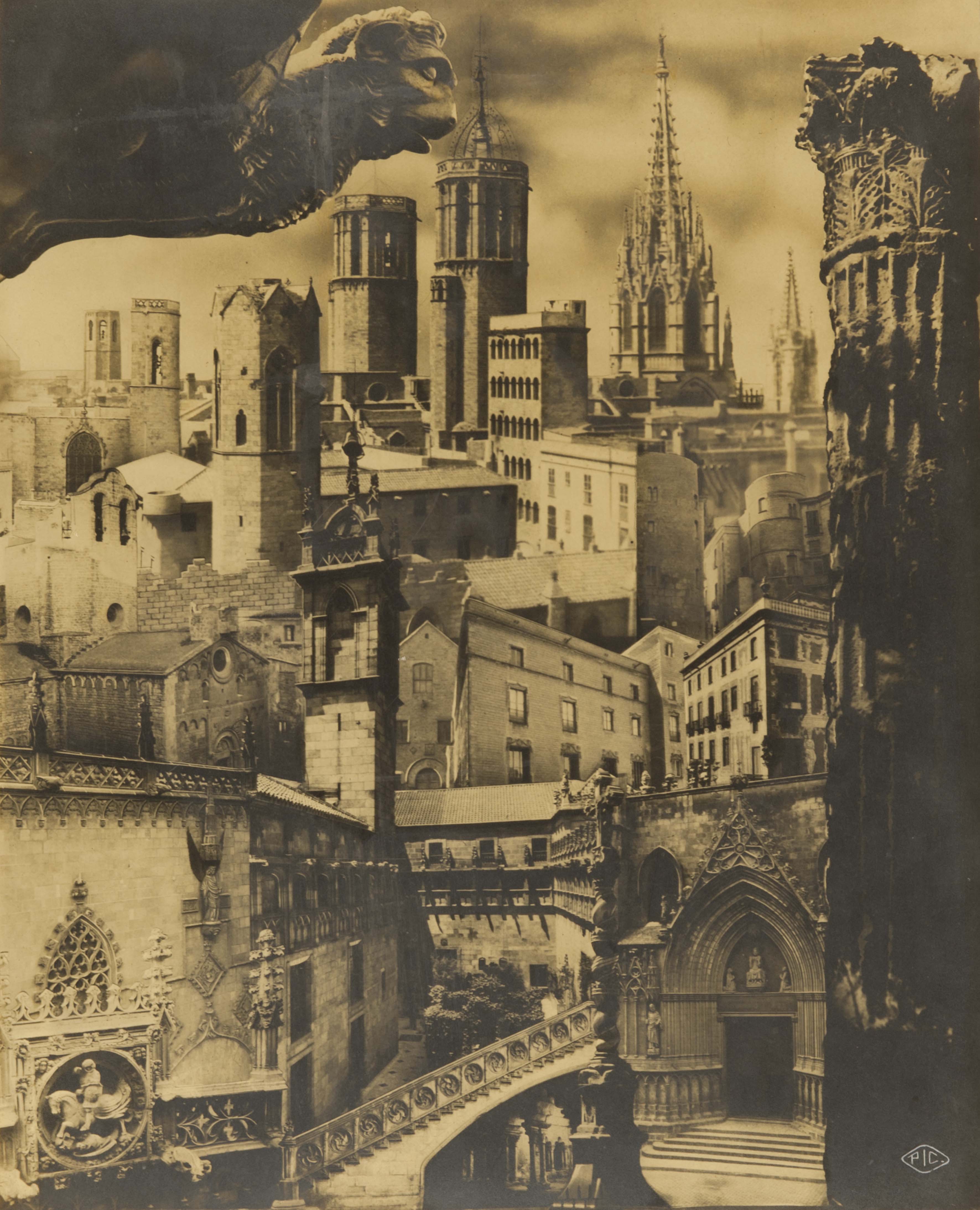 Pere Català Pic – Fotomuntatge sobre el Barri Gòtic per a la Sociedad de Atracción de Forasteros de Barcelona , 1935. Arxiu Fotogràfic de Barcelona.