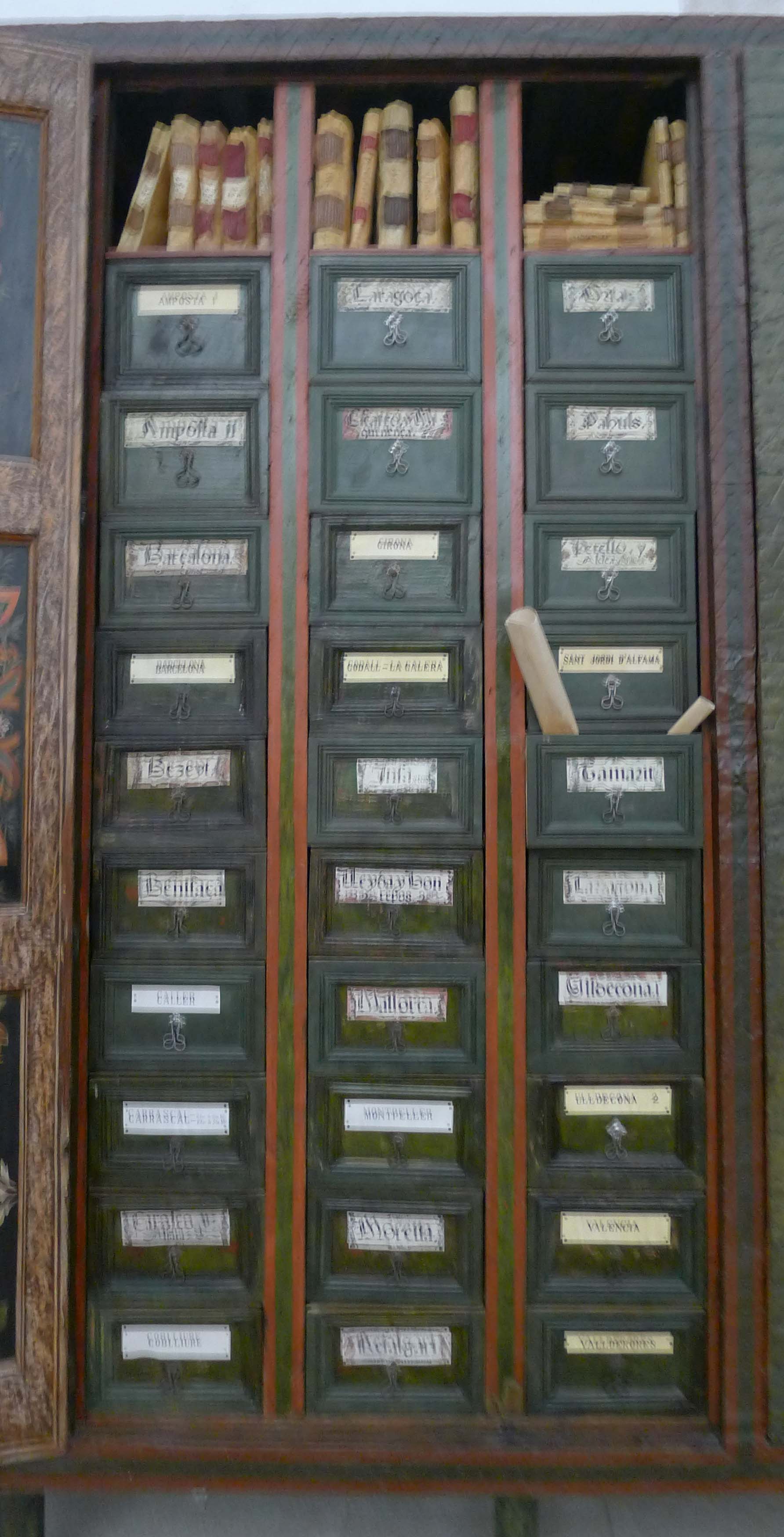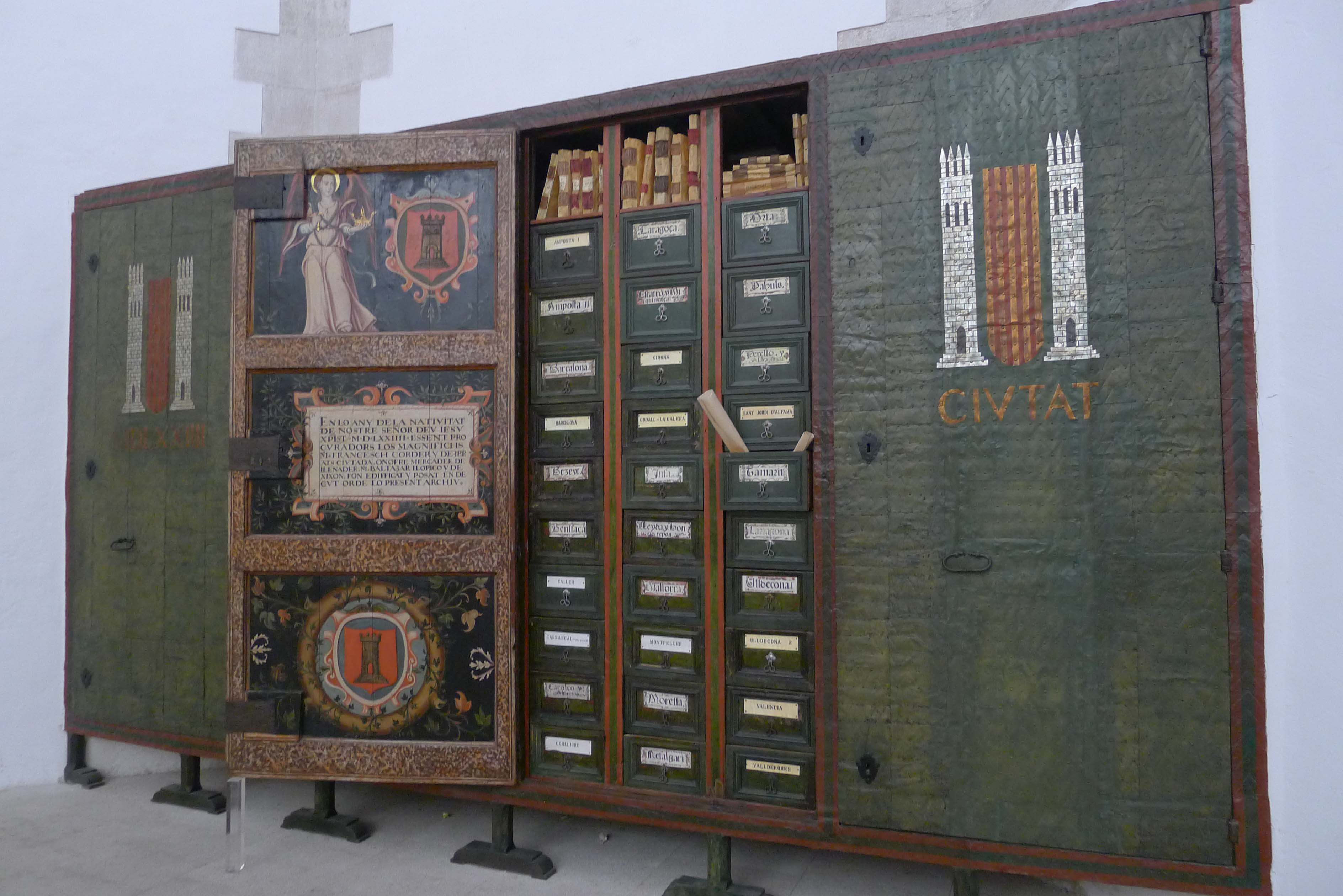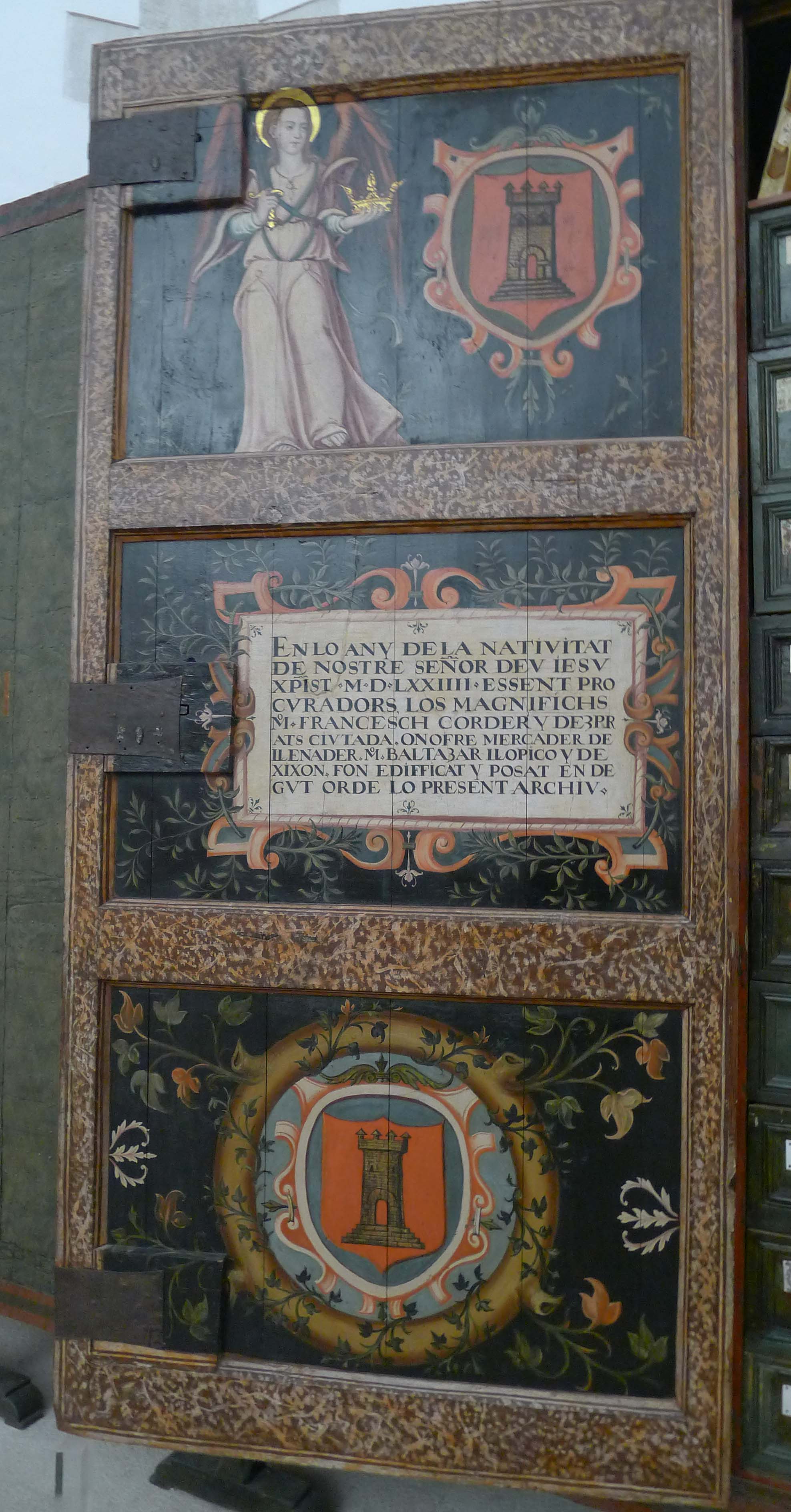 Dos elements criden especialment l’atenció en entrar a la nau: un armari de fusta que presideix l’espai des de la capçalera de l’antic temple i una porta de pedra. Ambdós són vestigis del poder civil de la Tortosa del segle XVI, perquè provenen de la desapareguda Casa de la Ciutat. L’armari és de l’antic arxiu de Tortosa i l’interior d’una de les portes està decorat amb l’escut de la ciutat, a la part de sota i l’Àngel Custodi, que n’és el patró. Al centre una llegenda on es pot llegir: “En lo any de la nativitat de Nostre Senyor Déu Jesucrist de 1574, essent procuradors los magnífics mossèn Francesc Corder i Desprats, ciutadà, Onofre Mercader de Llenyader y mossèn Baltazar Llopico y de Xixon, fou edificat i posat en degut orde lo present Arxiu”. A l’interior hi ha unes lleixes i calaixos amb els noms de diverses ciutats amb les que Tortosa tenia relacions. Aquest armari-arxiu va estar en ús fins a la darrera dècada del segle XX.