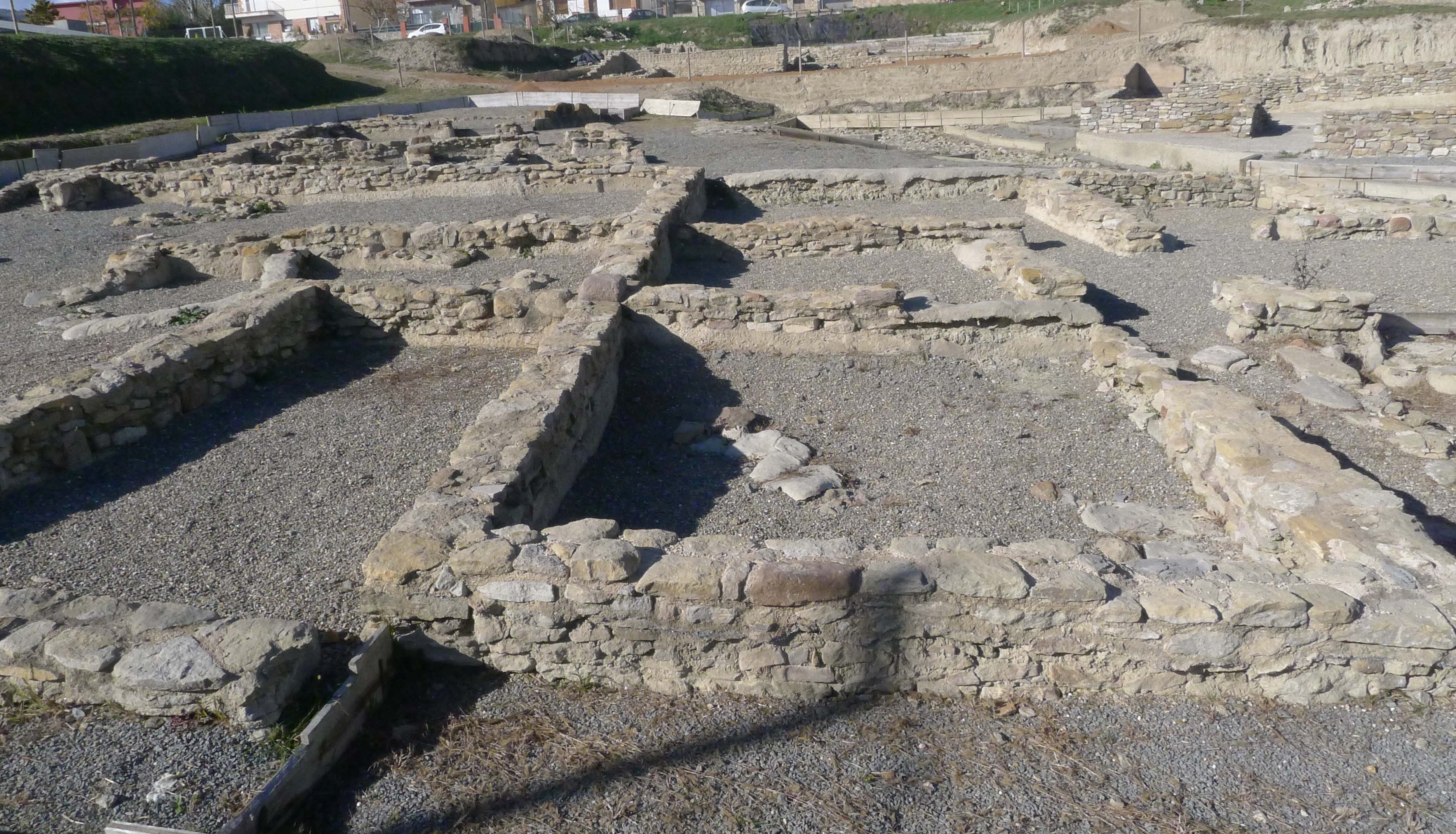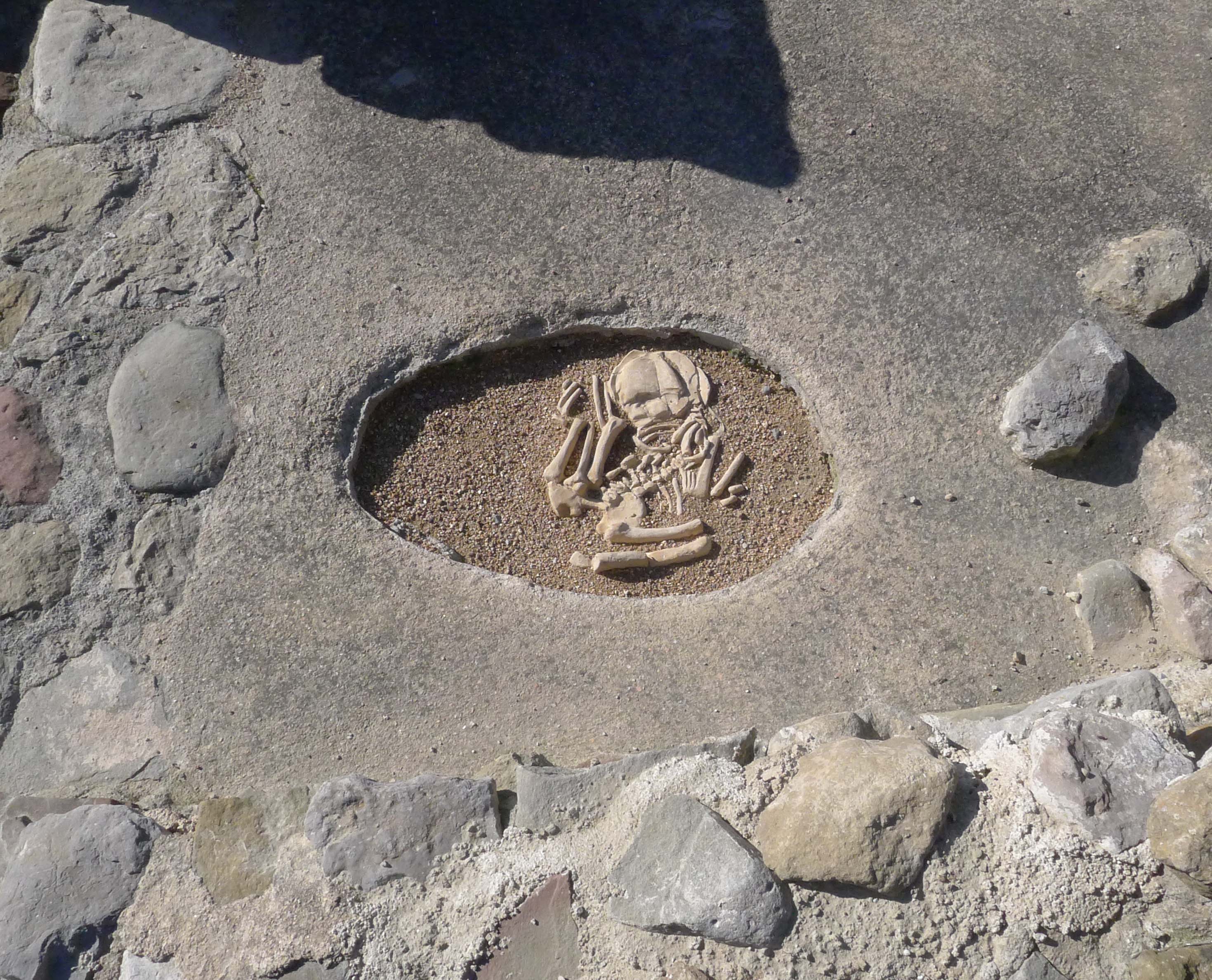 Passejant pel jaciment, tot seguint el recorregut marcat, podem veure els vessaments dels edificis i com era la distribució interior. En un moment donat, però, ens trobem amb un element que crida força l’atenció. En el paviment d’una de les habitacions hi ha una mena de sot, remarcat amb un color vermellós a l’interior del qual s’hi pot veure un esquelet. És la reproducció d’un enterrament infantil. Aquesta és una mostra dels rituals que s’hi ha documentat. Així ens ho expliquen al web del jaciment: “A tots els edificis s’han trobat enterraments de nadons, la mort dels quals podria ser a causa del part o per malalties. Són petites fosses obertes al subsòl d’habitacions, molt a la vora de murs sovint relacionades amb reformes de les cases. Aquestes reformes tant podrien formar part d’un ritual de purificació de les llars amb motiu de les morts prematures dels infants com ser hipotètics sacrificis de fundació destinats a posar els nous habitatges sota la protecció de les divinitats”.