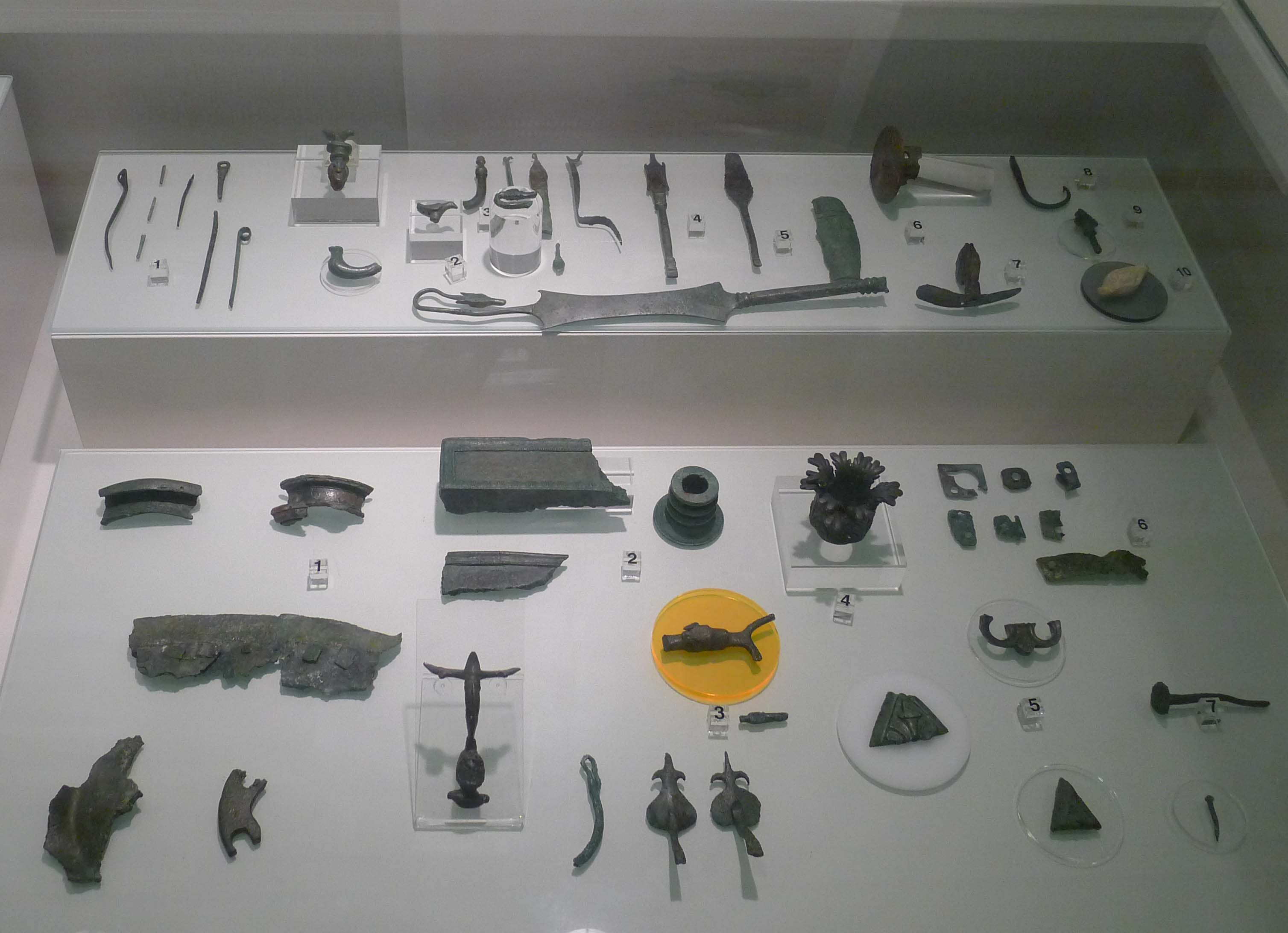 Entre els objectes que s’han trobat i que es poden veure a l’exposició hi ha fragments i peces de ceràmica, com olles, plats o escudelles; també hi ha monedes de diferents tipus; elements d’abillament personal, com sivelles, anells de bronze i de ferro, penjolls, arracades, fíbules i amulets; peces d’armament, com puntes de fletxa o projectils de fona; i elements de mobiliari i d’aixovar, com plaques decoratives, nanses de vaixella, canelobres, aplics o claus.