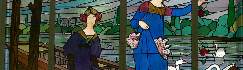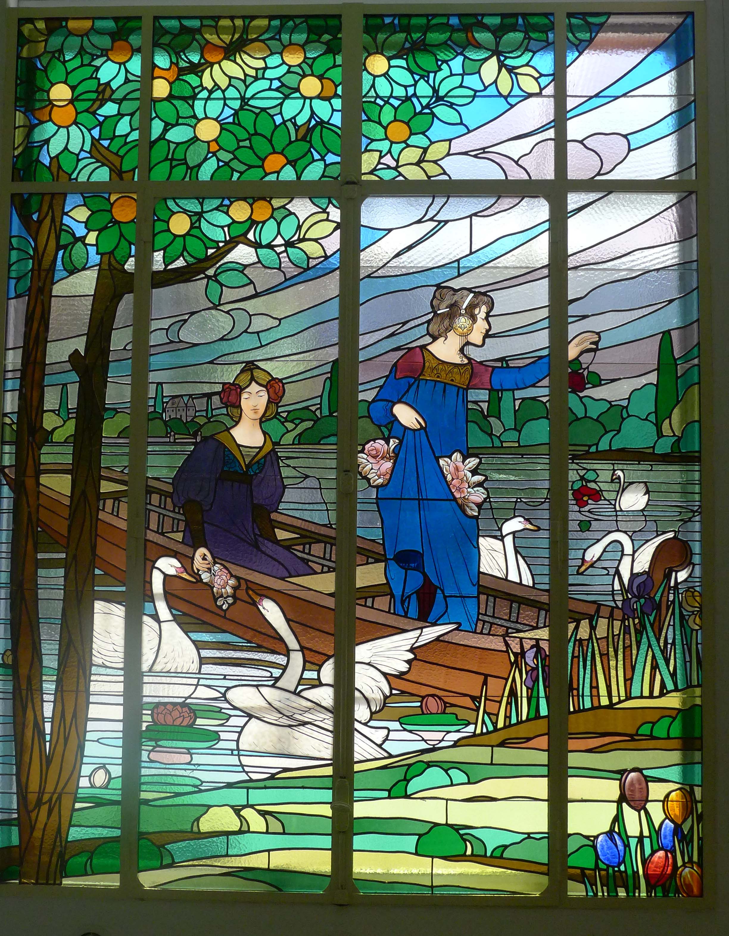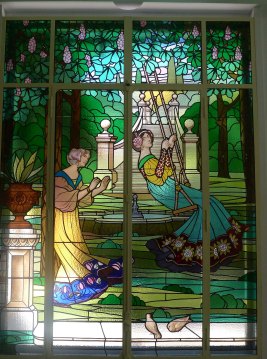 Txema Romero, historiador de l’art i director del Museu d’Art de Cerdanyola, i Jordi Bonet, químic i restaurador de vitralls, els descriuen en un article publicat a la revista Rescat, editada pel Centre de Restauració de Béns Mobles de Catalunya: “El plafó situat en un dels laterals s’ha anomenat Dames del gronxador i els dos plafons frontals, que se situen en un mateix escenari interromput pel pilar de la façana, les Dames del llac o Dames dels cignes i les Dames de les tulipes en el primer, les dues figures femenines estan a dalt d’una barca envoltada de cignes, i en el segon, les dames recullen flors a la vora del llac. Iconogràficament, crida l’atenció la constant presència de flors, que podria tenir una lectura simbòlica, que arriba al seu zenit a l’escena del llac on les dames alimenten els cignes amb peònies —la rosa sense espines—, en una imatge que podria tenir lectures literàries que ens remeten a la consumació de l’amor i al mite de Leda i el cigne. de fet, els tres plafons podrien fer al·lusió als tres estadis de l’amor: l’enamorament, l’esplendor i la malenconia”.
