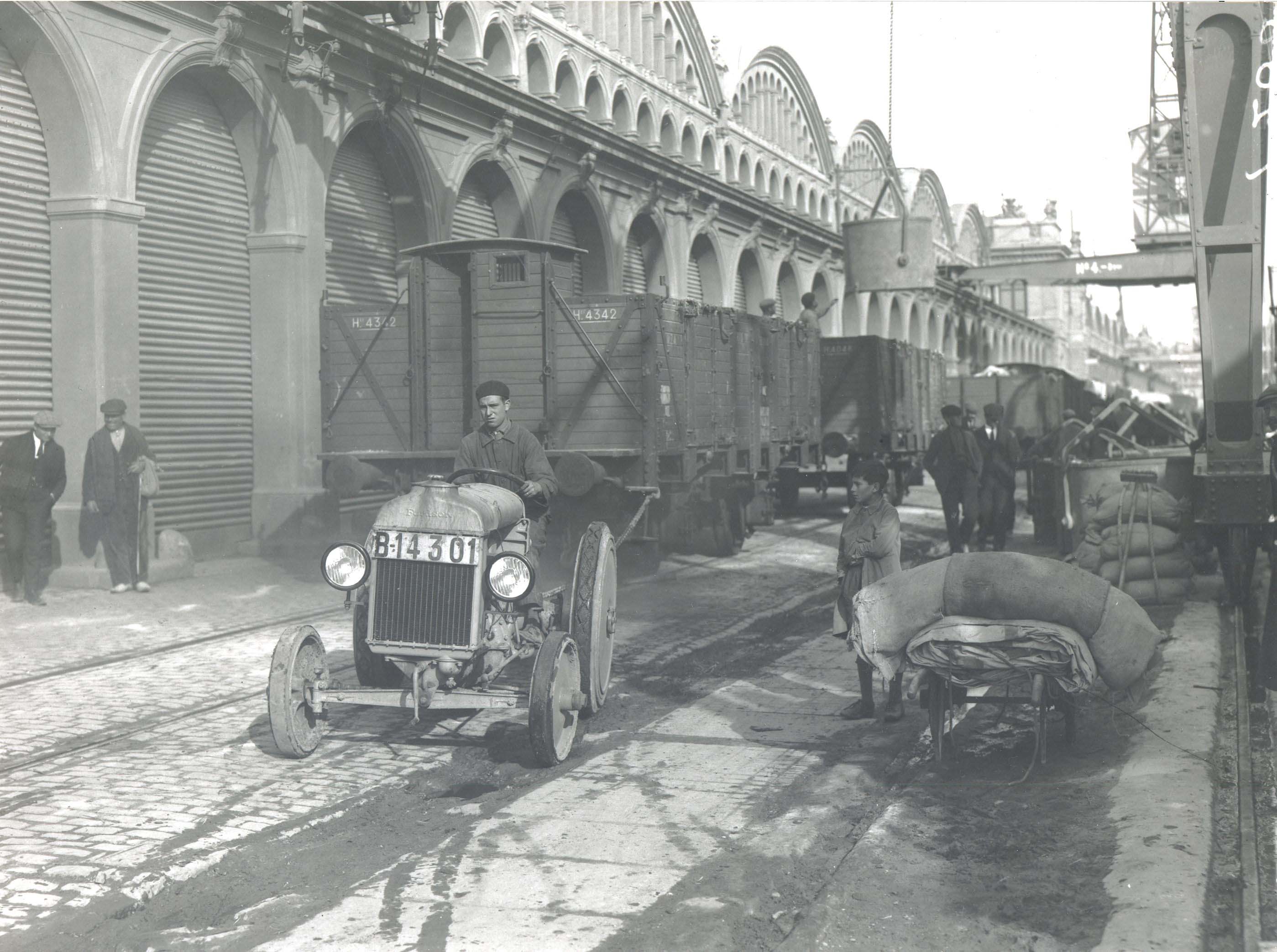 Magatzems del moll de Bosch i Alsina, amb tres vagons de càrrega que avancen per les vies del ferrocarril. Autor desconegut. AAP.