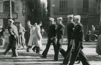 Quatre mariners nord-americans passegen per la Rambla, el gener de 1952, en la segona visita a Barcelona. Foto: Pérez de Rozas. AFB.