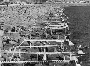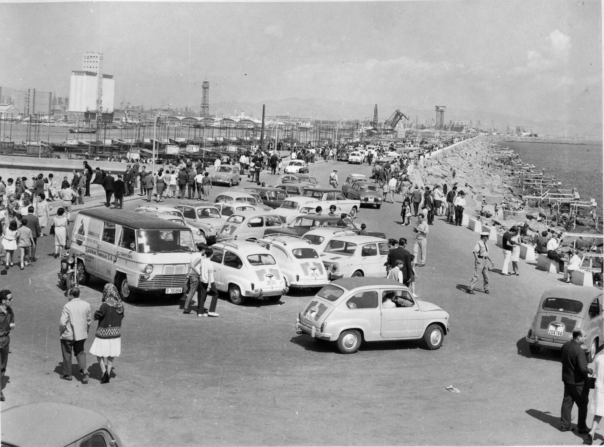 Vista diürna de l’inici de l’escullera, plena d’automòbils i vianants, i les plataformes dels pescadors amb canya a la dreta. Autor desconegut. AAP.