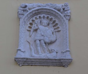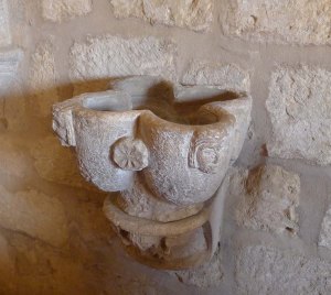 A prop de l’entrada hi ha una curiosa pica beneitera tardogòtica tallada. Té forma quadrilobulada. A la decoració hi ha dos caps humans i unes flors. És possible que es tracti d’un antic capitell reutilitzat com a pica.