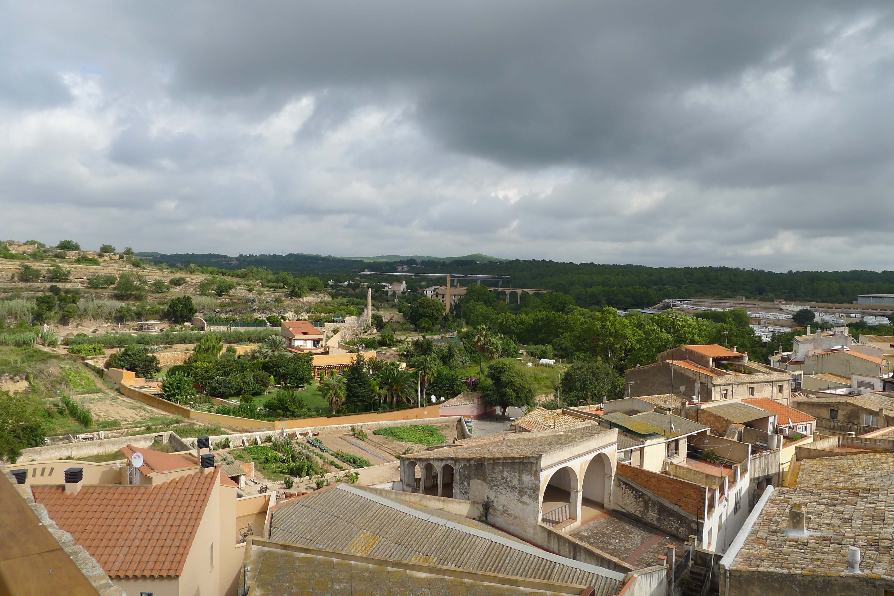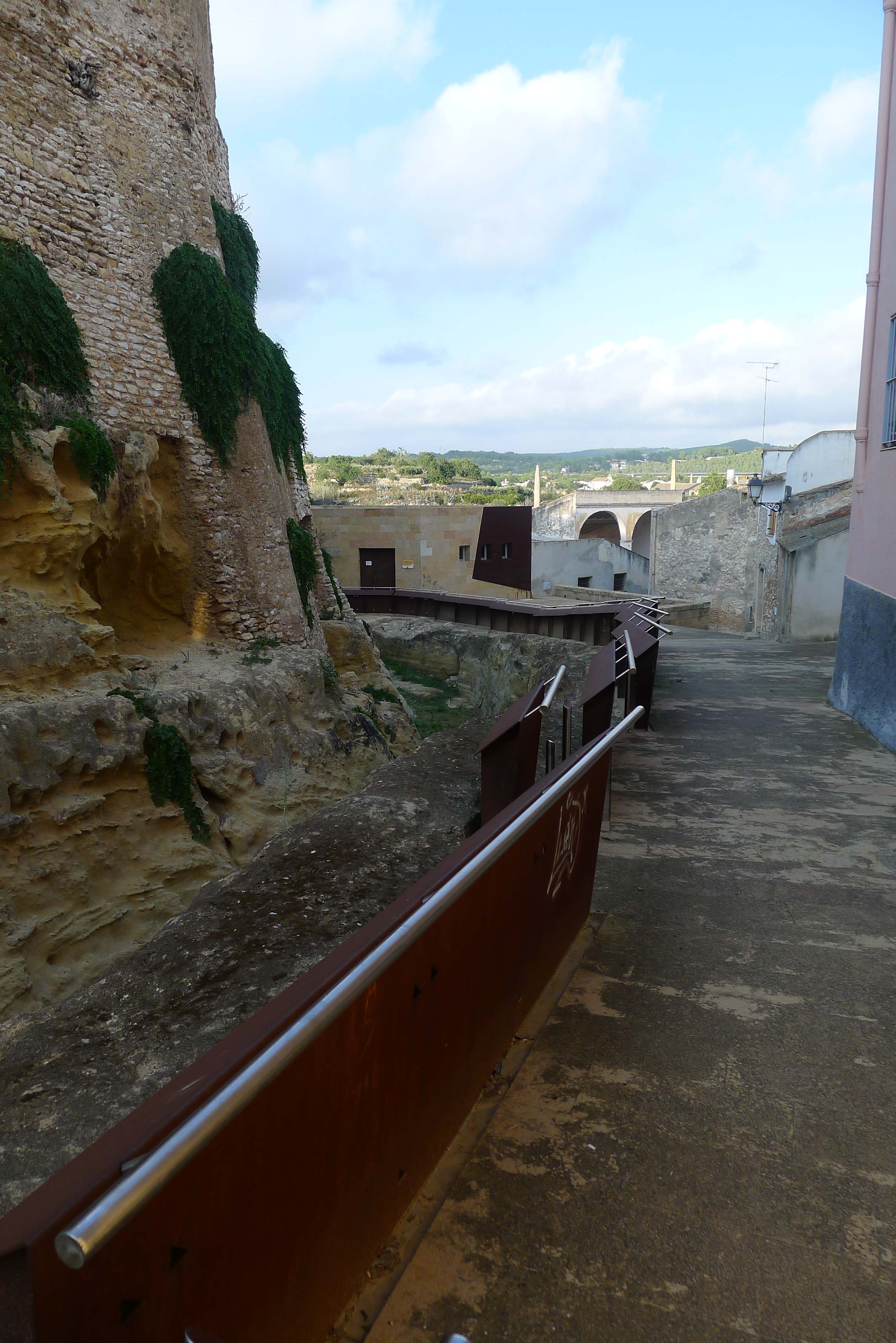 Durant la visita s’accedeix a un parell de terrasses des d’on es pot veure, per una banda, una perspectiva sobre el poble amb alguns elements destacables, l’església de Sant Joan Baptista o l’Agulla, un monòlit d’uns 12 metres d’alçada, fet amb pedra i morter de calç, amb utilitats d’enginyeria hidràulica. Se’n té constància documental des del segle XVII, però es creu que podria ser molt anterior, del segle XIV. Pel que fa a l’església, va ser erigida sobre un temple romànic anterior, va ser construïda entre 1776 i 1790 i la seva orientació està relacionada amb els senyors del castell, que en van sufragar les obres. Des del mateix punt, es poden veure dos ponts del ferrocarril, l’antic i el nou; el riu Gaià o l’ermita de Sant Ramon. Continuem la visita a l’interior del castell, perquè a tocar de la torre nord hi ha una terrassa des d’on hi ha una molt bona perspectiva de les restes que queden del poblat de l’època de l’edat del bronze.