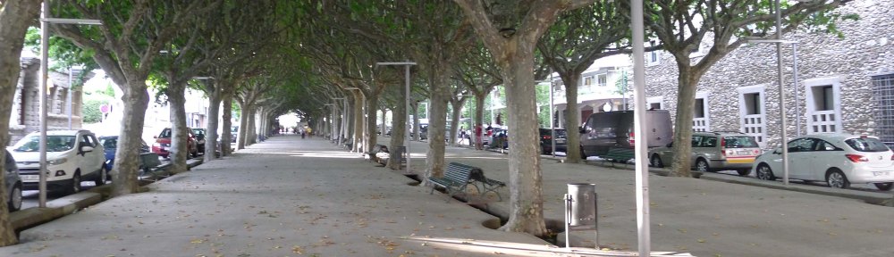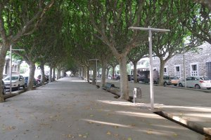 Les branques i el fullatge dels tres rengles de plàtans del passeig de Joan Brudieu formen una mena de túnel natural amb una ombra que ajuda a passar la intensa calor de l’estiu. A més, al centre i a banda i banda del passeig central, en paral·lel a les fileres de plàtans, hi ha un rec que uneix els escocells dels arbres i per on corre aigua.