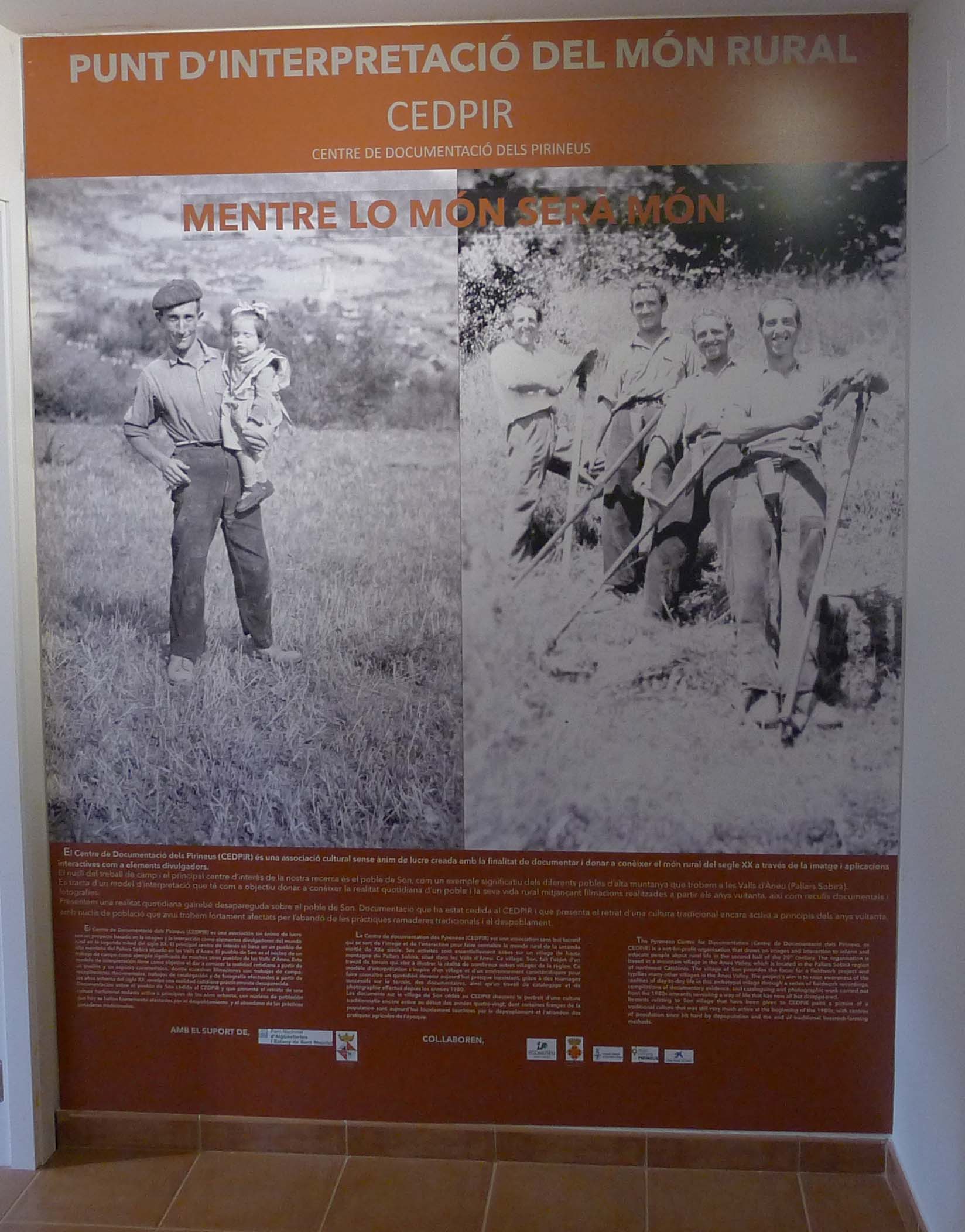 A la planta de baix es pot veure un audiovisual sobre l’art romànic i també una exposició amb plafons amb imatges i explicacions, de manera que entre ambdós sistemes, vídeo i plafons, podem fer un bon recorregut pel romànic pallarès sense moure’ns del lloc i, potser, descobrir algun detall o algun lloc que no coneixem i que podem anar a veure després. Al pis superior hi ha una exposició sobre el món rural, també hi podem veure un audiovisual i una exposició amb plafons, amb moltes imatges que ens mostren com era la vida a Son i a la comarca al llarg del segle XX. Hi ha fotografies de grups, de festes i celebracions, de persones feinejant, de ramats, de matxos carregats, o els darrers alumnes de l’escola de Son, quatre nenes i un nen, fotografiats l’any 1973. El Centre de Documentació dels Pirineus ofereix diverses activitats i compta amb una petita botiga on es poden comprar llibres i records.