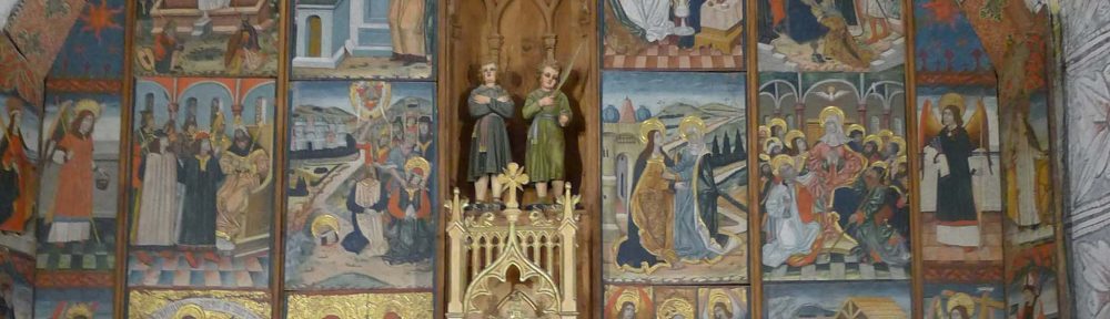 Tornem a la visita. El conjunt monumental s’erigeix majestuós a l’entrada del poble venint des d’Esterri d’Àneu. Està format per l’església, dedicada als sants Just i Pastor, la torre campanar i la torre del comunidor. L’edifici, d’estil romànic llombard, va ser bastit al tombant dels segles XII i XIII. A l’església hi ha diversos elements d’interès que anirem veient. Tornem un moment a la Geografia General de Catalunya per veure què ens en diu Ceferí Rocafort: “En lo temple s’hi pot apreciar un notable retaule gòtich, essent també molt interessant lo campanar romànich, si bé apareix ab los finestrals mig trencats en los quatre o cinc estatges de que se composa. Se parla de l’església de Sonne en l’acta de consagració de la catedral de la Seu de l’any 819”.