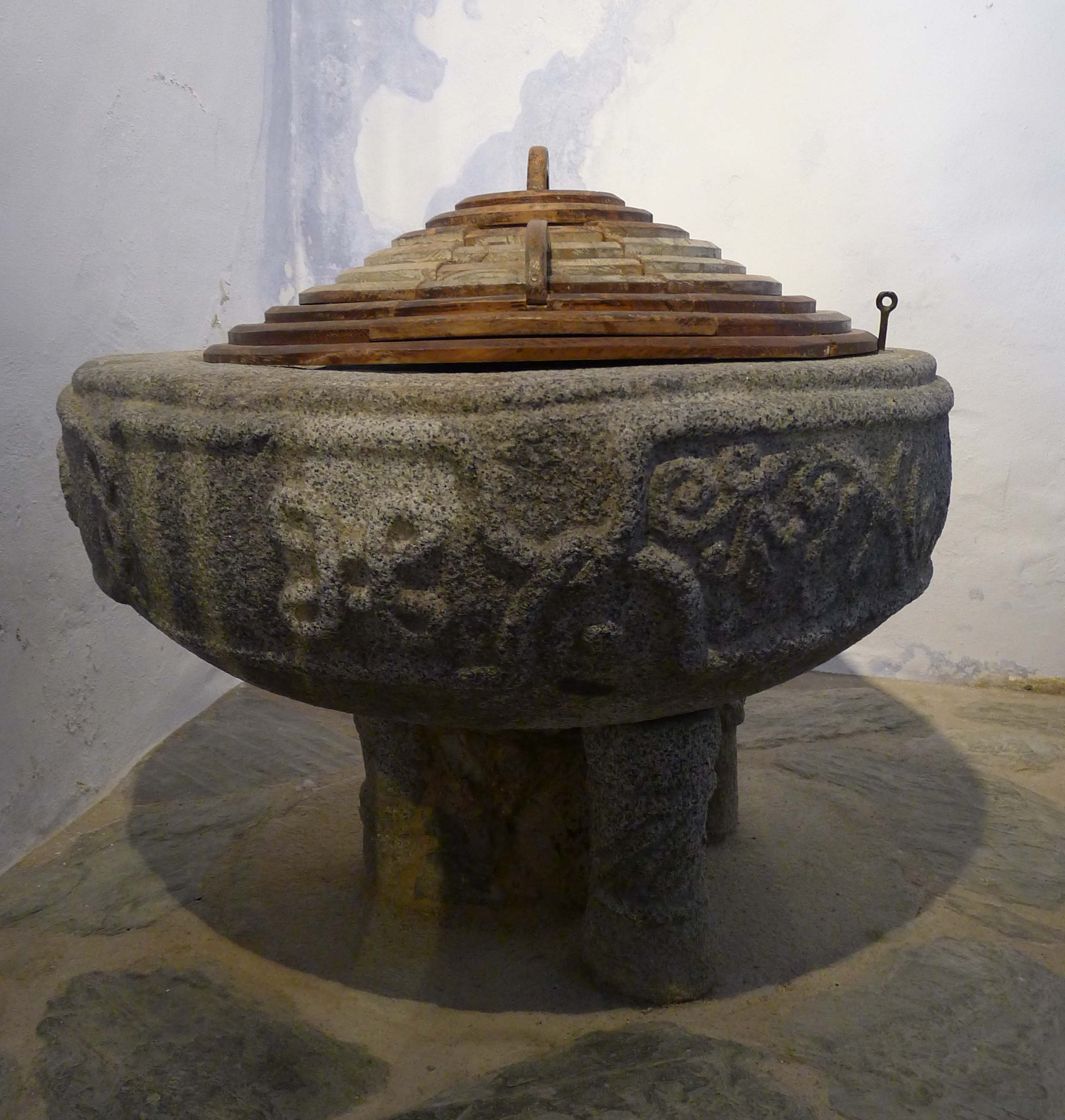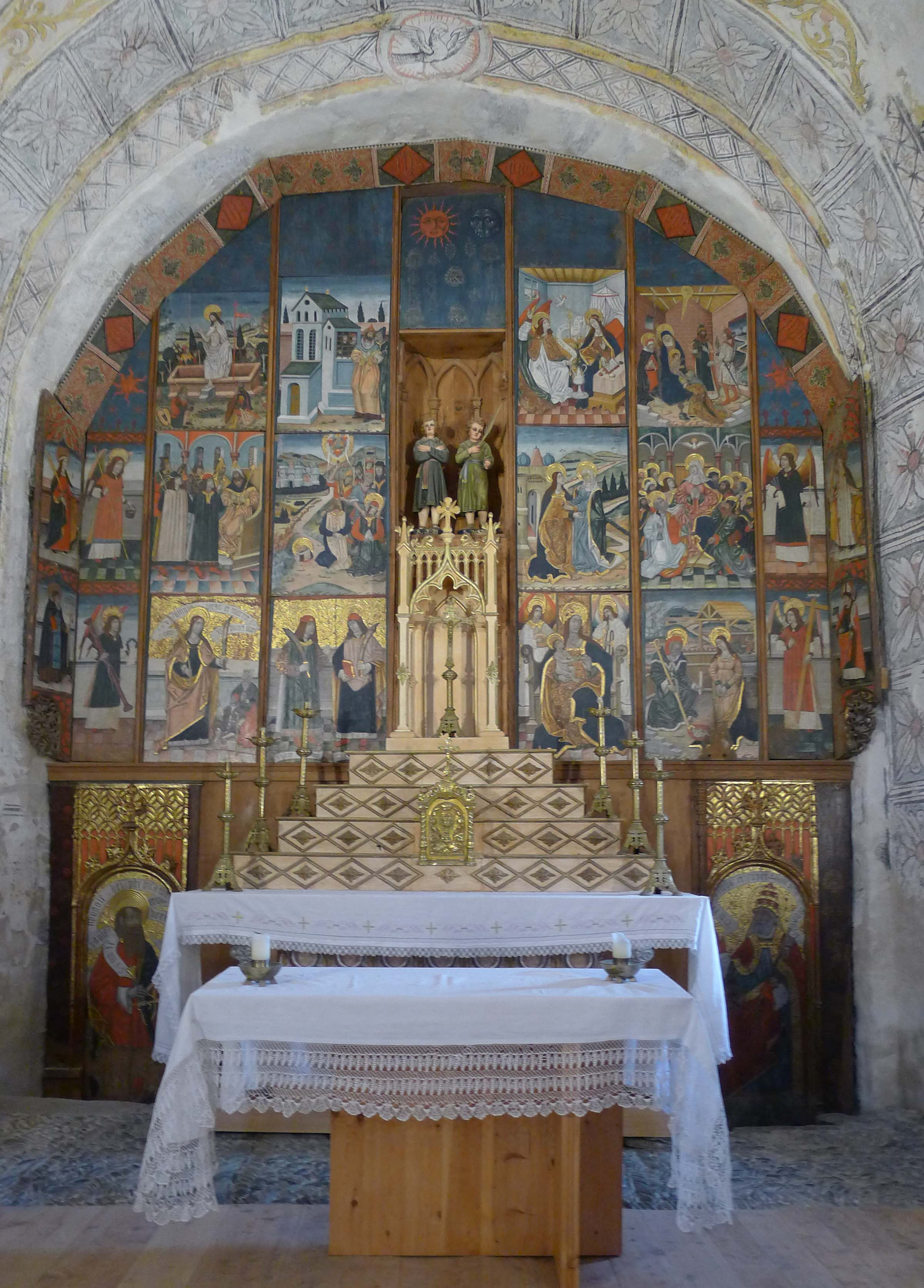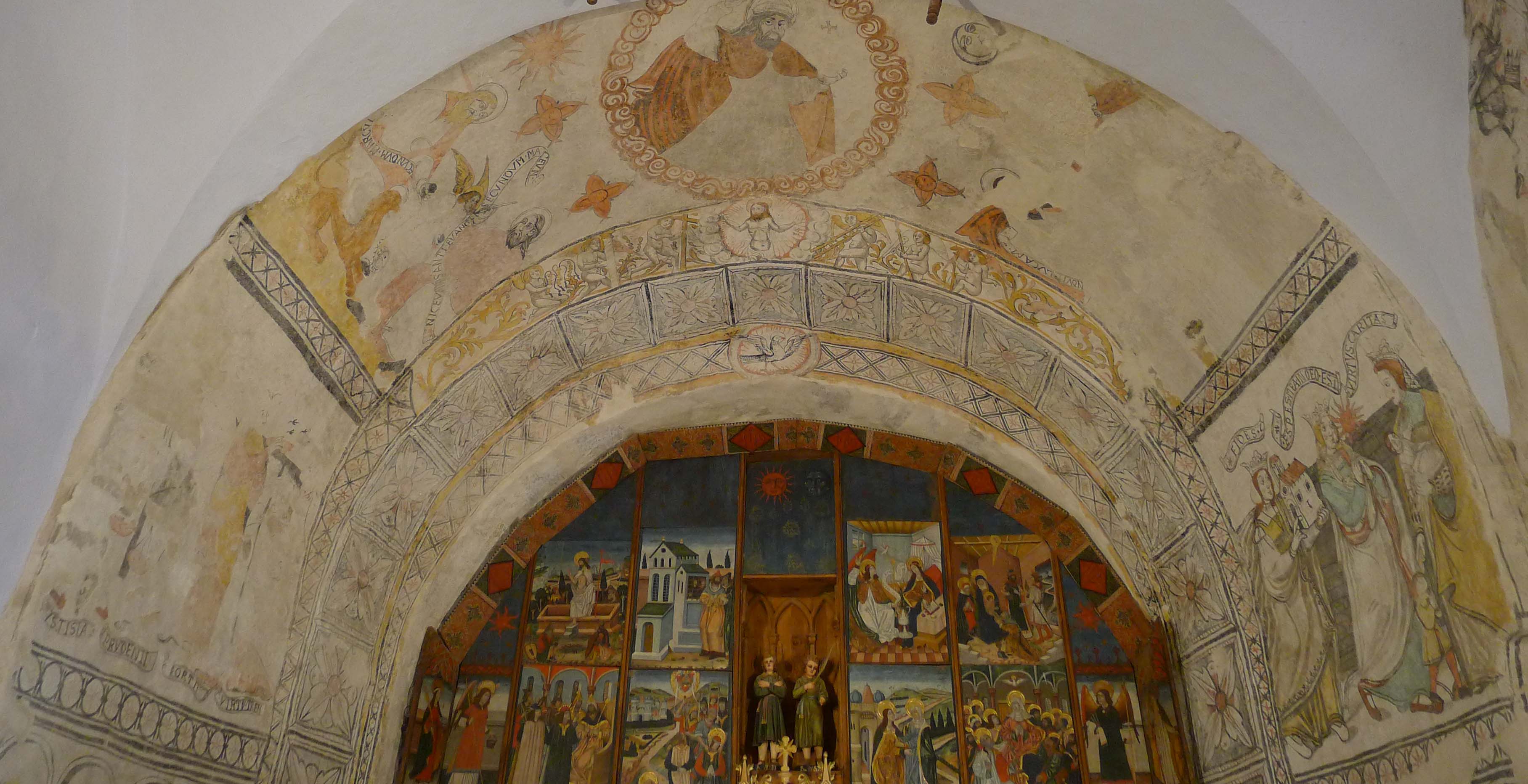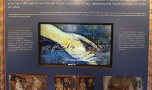 Anem a pams. L’església és un edifici d’una sola nau al qual s’hi van afegir, capelles laterals. A la capçalera hi ha un absis amb un arc presbiteral al davant. Encaixat a l’absis i emmarcat per l’arc presbiteral hi ha un retaule gòtic del segle XV, del qual n’és autor Pere Espallargues. L’arc que l’emmarca està decorat amb pintures murals, amb alguns detalls força curiosos. Al peus de l’església hi ha unes altres pintures murals, que s’han conservat pitjor, però que també tenen detalls d’interès. Una de les capelles laterals va ser convertida en baptisteri i al seu interior hi ha una pica baptismal semiesfèrica de granit decorada amb motius vegetals i geomètrics. I encara hi ha dues piques de pedra més, però aquestes son per altres usos. Són piques d’oli. S’utilitzaven per desar l’oli que s’utilitzava per les llànties i per als ritus litúrgics.