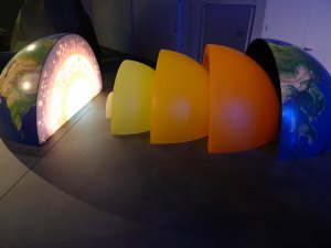 A la Cambra no hi ha un recorregut determinat, podem anar investigant i descobrint al nostre aire, i amb el nivell d’interès i de profunditat que vulguem. Hi podem veure com està formada la Terra i que al centre del planeta hi ha el nucli, envoltat pel mantell, l’astenosfera i litosfera, on hi ha l’escorça, que és la part més externa i que pot ser oceànica o continental. De fet, a l’inici dels temps, la Terra era una gran massa de foc, a poc a poc, la part més exterior es va anar refredant i solidificant i es va formar l’escorça i l’escalfor que queda a l’interior busca la manera de sortir a l’exterior i ho fa aprofitant les escletxes que permeten que surti el magma. I què és el magma? Doncs és una barreja de materials rocosos fosos que contenen fragments de roques, minerals i gasos dissolts, que es forma a gran profunditat on les roques es fonen a causa de l’enorme escalfor, la disminució de la pressió i la presència d’aigua. Quan el material fos té menys densitat que el sòlid, puja i genera una erupció en el moment en que arriba a l’exterior de l’escorça.