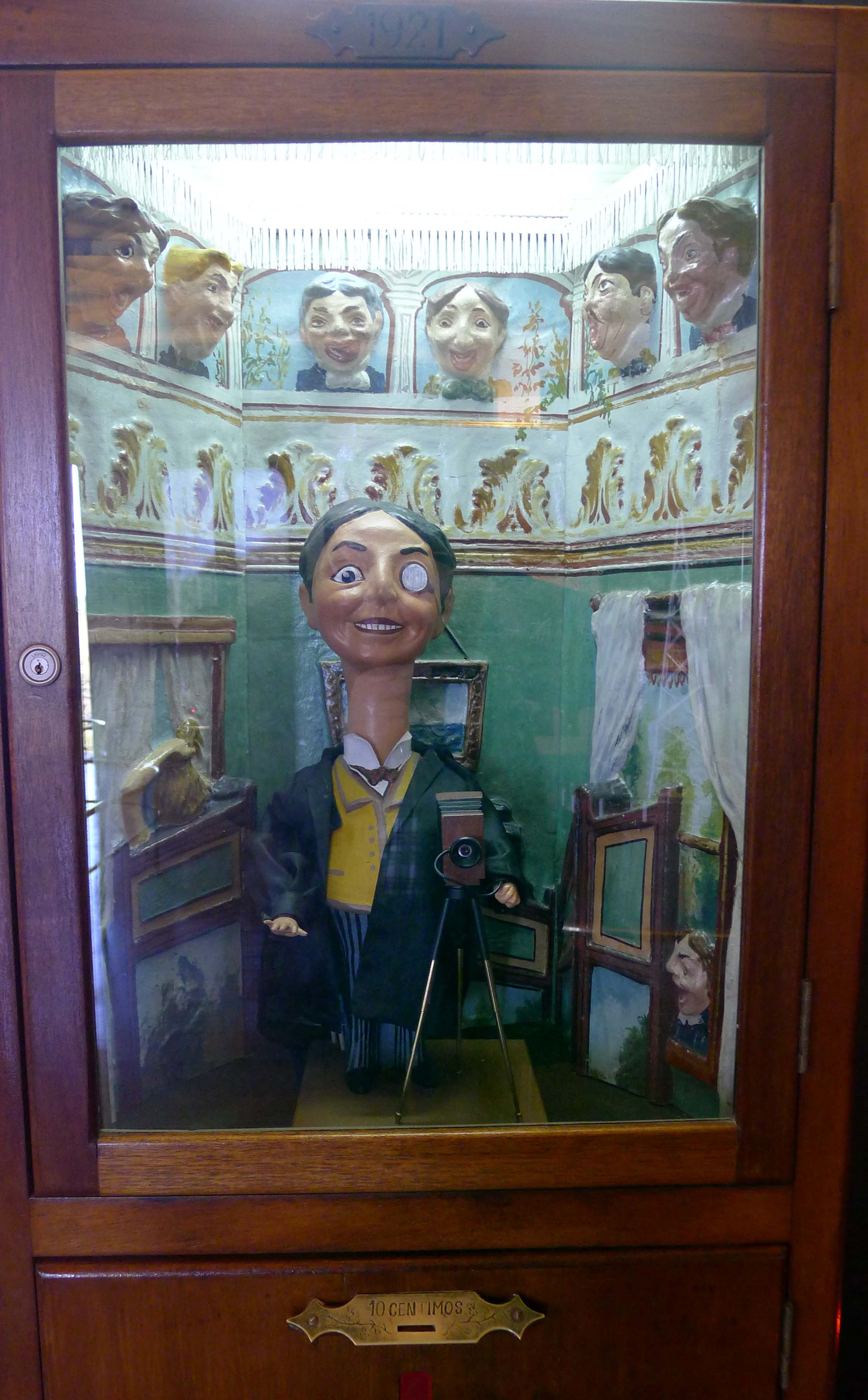 La Vident, creada el 1944 i d’autoria desconeguda, és una gitana que, en estirar una anella, lliurava una targeta amb el futur de la persona, una targeta que sortia per un forat diferent segons si qui ho demanava era home o dona. Aquest autòmat no funciona, perquè no té el mecanisme intern. En una altra vitrina, el Turista, amb barret, bermudes, camisa florejada i xancletes, fa una foto amb la càmera que du a les mans. És de l’any 1970 i d’autoria desconeguda. I parlant de fotografia, tenim també l’X. Ray photo, el típic retratista d’estudi de principi del segle XX. El van fer a Anglaterra l’any 1921.
