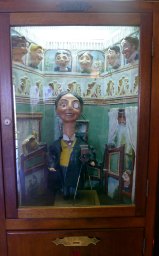 Just a l’entrada en rep un personatge amb gorra i armilla de pana i un cop dins ens trobem una antiga bàscula automàtica que facilitava el pes de la persona després de posar-hi una fitxa. Un dels personatges que la va utilitzar, en una de les vistes que va fer al Tibidabo, va ser el rei Alfons XIII. Al costat mateix ja tenim el degà dels autòmats, amb gairebé un segle i mig de vida, és el Pallasso mandolinista, creat per Gustave Vichy l’any 1880. El personatge està assegut en una cadira i, en accionar-lo, interpreta malenconioses melodies amb la seva mandolina. Durant la seva actuació mou diverses parts del cos i en acaba saluda i agraeix l’atenció dels espectadors amb una inclinació de cap.