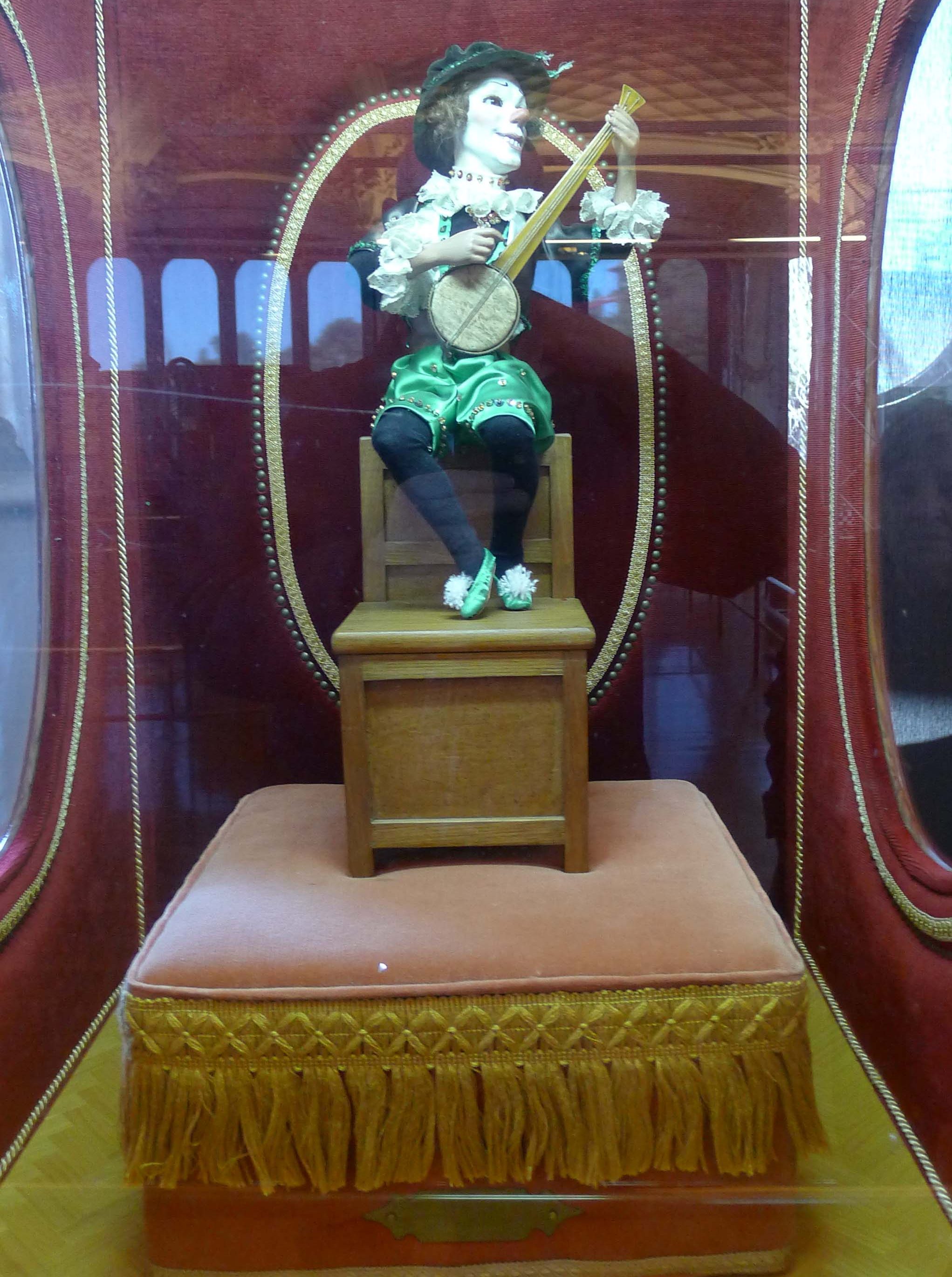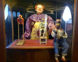 El següent autòmat també és més que centenari. És el Pallasso i els micos, que va ser fabricat l’any 1908 per Vichy i Triboulet, i està composat per cinc personatges: un pallasso que toca un manubri, tres micos que segueixen les seves ordres, un dels quals fa la vertical al capdamunt d’una escala i un altre, que fuma, segueix el ritme de la música amb el peu. Encara, un altre mico apareix per darrera el cap del pallasso. Entre els autòmats més antics n’hi ha de diversos amb pallassos i personatges del món del circ, de la màgia, de la música i de l’espectacle en general. I és que era una manera que tenien els primers creadors de buscar la diversió dels espectadors.