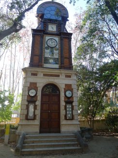 Un altre element molt destacable és la torre del Rellotge. Es tracta d’una torre amb una completa estació meteorològica. És un edifici de planta quadrada amb tres cossos d’alçada. Hi ha termòmetre, baròmetre, pluviòmetre, rellotge amb calendari i fase lunar i informació de la direcció del vent. Aquesta torre no va ser pensada per estar en el parc. Era als jardins del Teatre Líric de Barcelona, que estava situat a la cantonada dels carrers de Mallorca i de Pau Claris, on havien hagut els Camps Elisis, però quan es va enderrocar el teatre, Emili Arnús la va fer traslladar, pedra a pedra, al lloc on és avui.