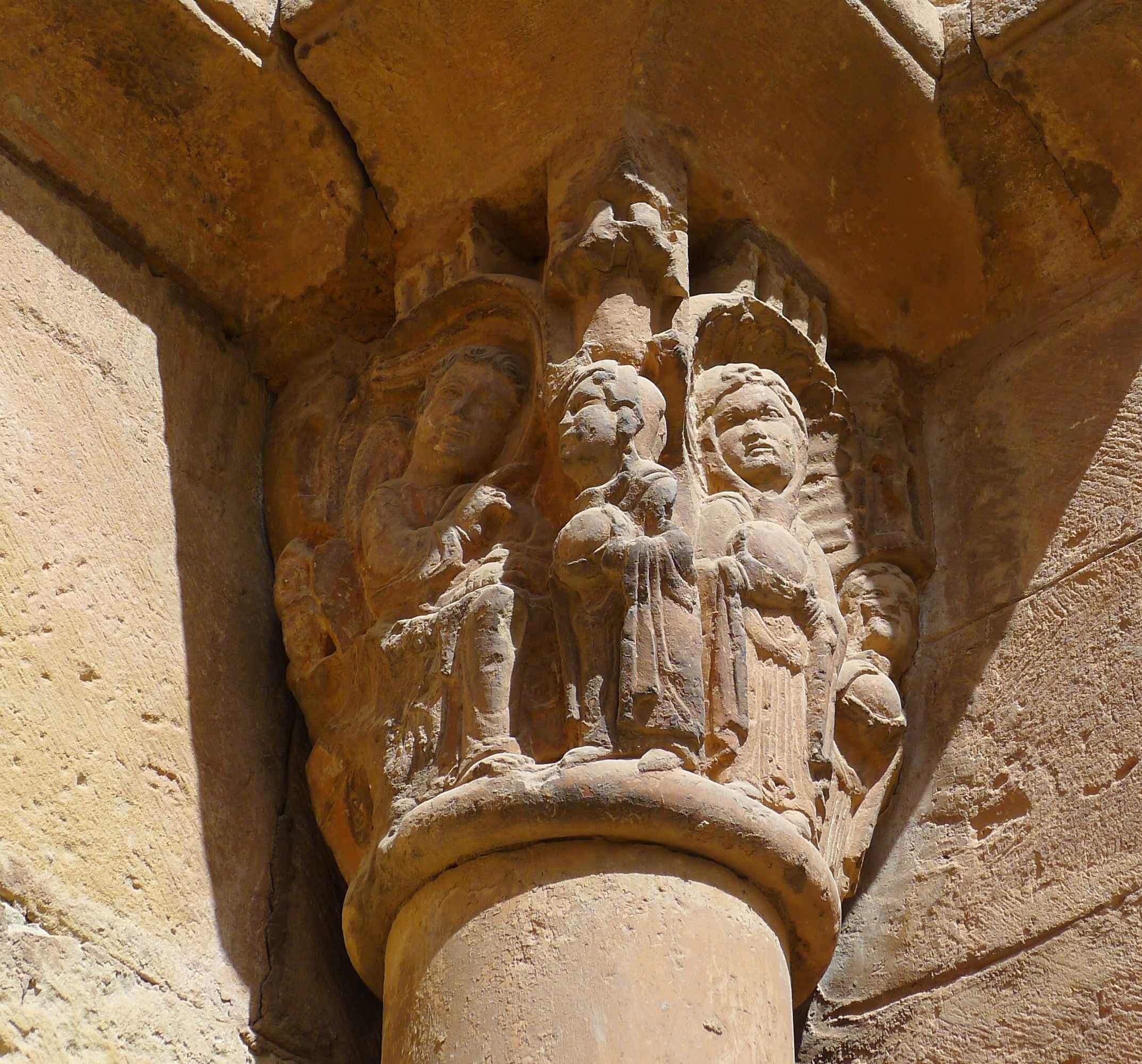 A la portalada destaca el timpà, amb la figura de Jesús en majestat amb el tetramorf al seu voltant. Du un llibre a la mà esquerra i la dreta la té aixecada en acció de beneir. A cada banda de la porta hi ha dues columnes amb capitells esculpits, deguts, també a Arnau Cadell. En un s’hi representa el pecat original, amb Adam i Eva; en un altre hi ha la visita de les tres dones al sepulcre de Jesús i els altres dos tenen motius vegetals.