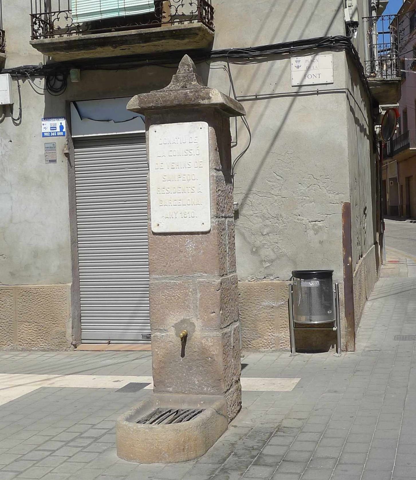 Un punt amb molta història, tot i que ara no es pot veure, encara que està ben documentat, és la Font de les Escales, allà on avui hi ha la plaça de la Font i el carrer del Clot de les Aigües. En aquest lloc hi havia hagut una font que està documentada des de l’any 1548, tot i que se’n té notícia des de l’any 1291 per uns horts que es regaven amb la seva aigua, que passava per un canal que anava pels actuals carrers del Passeig, del Convent i de la Muralla de Manresa. L’any 1750, amb motiu d’un episodi de sequera, va ser ampliada i es va construir una mina de 50 metres de llargada. L’any 1902 hi va haver algunes epidèmies, causades per les filtracions dels femers de les cases i es va tancar la font, mentre se’n construïen unes de noves. De fet, a l’indret hi ha dues fonts modernes amb una placa amb la inscripció: “DONATIU DE LA COMISSIÓ DE VEHINS DE SANTPEDO. RESIDENTS Á BARCELONA. ANY 1910”. (sic). La frescor de l’aigua feia que la gent hi seguís anant a buscar aigua per a refredar begudes i aliments, fins a l’aparició de les neveres. L’any 1978 l’Ajuntament va cobrir la font per facilitar el pas de vehicles. Un plafó, amb un croquis en recorda la història.