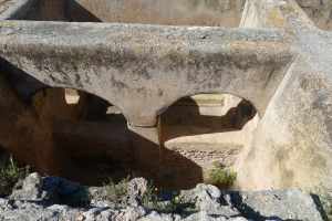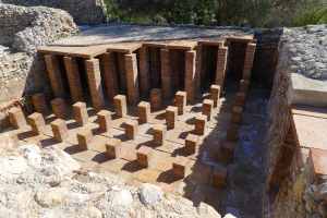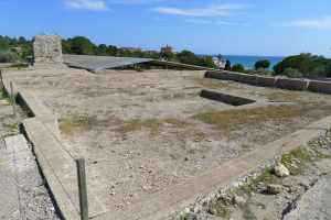 Després cal envoltar aquesta part central de la domus, passar pel que havia estat un peristil amb estany central, i arribar a la part més alta del turó, des d’on podem veure les estances de la domus per la part del darrera i diverses cisternes d’aigua. Una molt singular és la coneguda com a “Tartana” per la forma que té. Era un edifici amb volta de canó amb uns dipòsits al seu interior. I una mica més enllà, hi ha una altra cisterna d’aigua, soterrada, de gran capacitat, amb fins a vuit àmbits. Des d’aquest punt, hem de tornar enrere, per anar a buscar el que havia estat el corredor porticat que unia l’edifici principal amb les termes, situades en un angle del jardí. Al capdamunt del corredor hi ha el gran tricilini o menjador, on podem veure reproduccions dels mosaics del terra, i el mitreu.