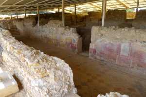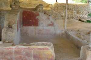 Un cop vista l’exposició, ja podem passejar per la vil·la. Cal enfilar una pujadeta i passar pel que havia estat un jardí ordenat amb terrasses i amb fonts per arribar a la domus, on podem veure un corredor semisoterrat. Encara queden dempeus part de les parets i es poden veure fragments de les pintures que les decoraven. Amb una mica d’imaginació, podem arribar a veure els habitants de la casa caminant pel corredor.