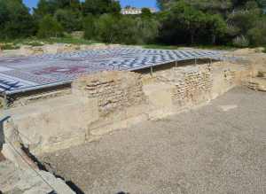 La domus o casa, estava situada al punt més alt del turó, amb unes magnifiques vistes al mar, que encara es poden entreveure entremig dels edificis moderns que s’han aixecat en part del que havia estat la finca i que avui separen el jaciment de les termes de la platja. En un dels plafons de l’exposició que hi ha al principi de la visita, ens expliquen que la casa tenia dues plantes, amb diferents dormitoris, sales de reunions i una galeria porticada al pis de dalt. Se suposa que hi havia habitacions d’estiu i d’hivern, habitacions de convidats, menjadors d’estiu –potser a l’aire lliure- i d’hivern, sales de repòs i d’estar, de lectura, cuina i biblioteca, entre altres. Com passa en aquests llocs, encara hi ha feina a fer, excavacions per dur a terme i espais per descobrir.
