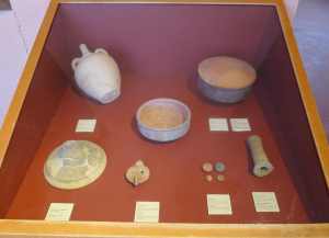 Entre els objectes exposats hi ha un capitell de marbre, un fragment de mosaic, plats de taula, una gerra pintada, una llàntia d’oli, fusaioles, un tub cilíndric de ceràmica per a la conducció d’aire calent, cassoles amb tapadora i un mural que decorava la font que Caius Valerius Avitus va fer instal·lar en una de les habitacions de la casa, tot aprofitant l’aigua d’una cisterna que hi havia just al darrera. El motiu que decora el mural és Oceà, la personificació mitològica de l’aigua, representat per un home gran, barbut, amb pinces de cranc, antenes de crustaci i envoltat de peixos. També hi ha una maqueta de fusta del jaciment i el cap d’una estàtua, que és una còpia de l’original que es conserva al Museu Nacional Arqueològic de Tarragona. Es tracta del retrat d’Antínous, un jove esclau, amic de l’emperador Adrià, que va morir prematurament,ofegat al Nil. L’emperador va instaurar el culte en el seu honor i va manar que s’erigissin efígies seves per tot l’imperi. El fet que aparegués aquesta estàtua als Munts s’entén com una manera del propietari de la vil·la de quedar bé amb Adrià quan aquest va visitar-la.