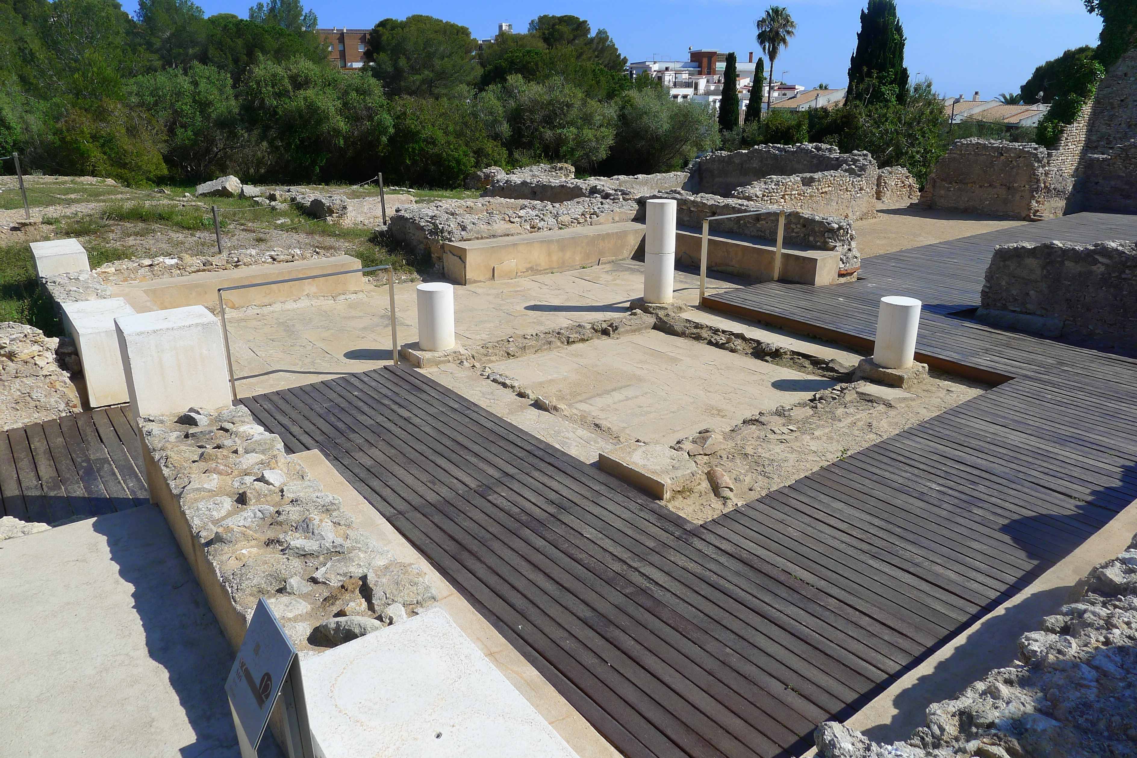 La domus o casa, estava situada al punt més alt del turó, amb unes magnifiques vistes al mar, que encara es poden entreveure entremig dels edificis moderns que s’han aixecat en part del que havia estat la finca i que avui separen el jaciment de les termes de la platja. En un dels plafons de l’exposició que hi ha al principi de la visita, ens expliquen que la casa tenia dues plantes, amb diferents dormitoris, sales de reunions i una galeria porticada al pis de dalt. Se suposa que hi havia habitacions d’estiu i d’hivern, habitacions de convidats, menjadors d’estiu –potser a l’aire lliure- i d’hivern, sales de repòs i d’estar, de lectura, cuina i biblioteca, entre altres. Com passa en aquests llocs, encara hi ha feina a fer, excavacions per dur a terme i espais per descobrir.